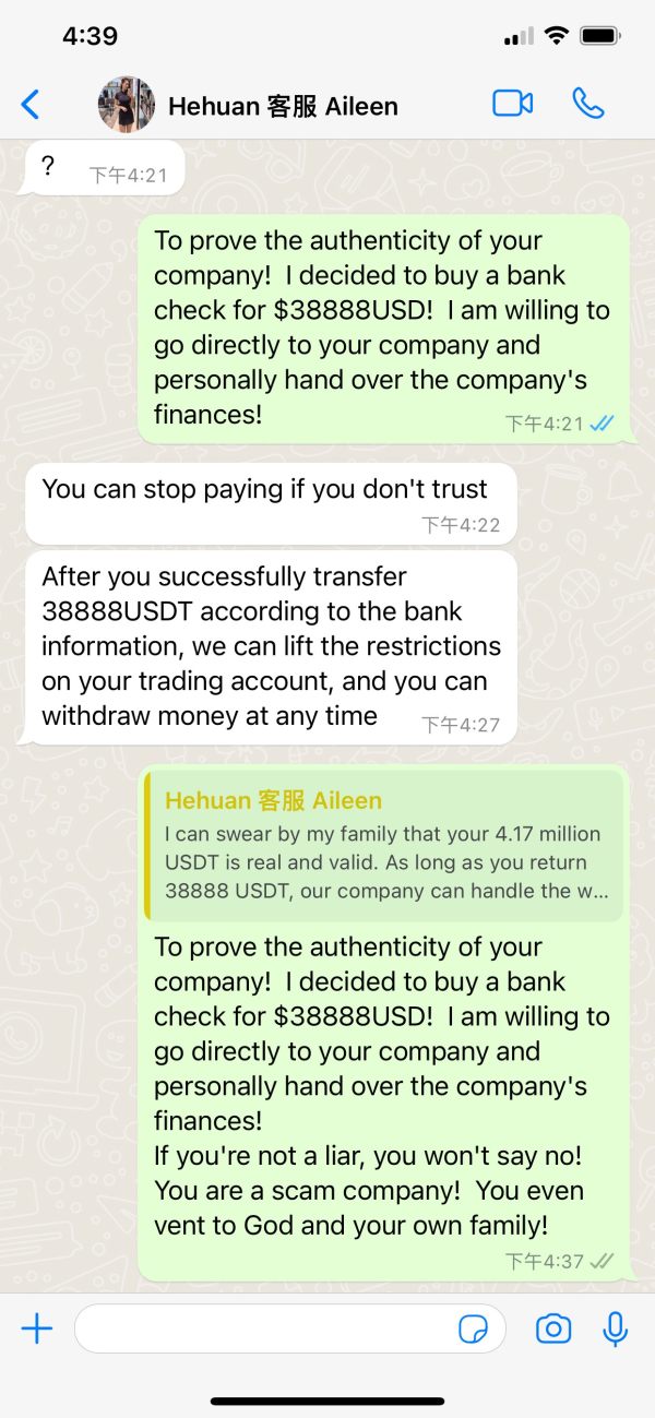 Overall, Hehuan's reputation in the trading community is far from favorable. Complaints regarding fund safety, manipulation claims, and unauthorized withdrawal freezes highlight the need for prospective traders to exercise caution and consider alternative options with reputable, regulated brokers.
