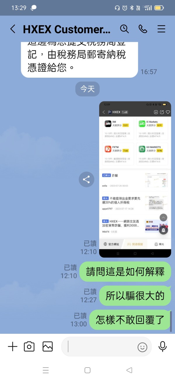The extensive lack of information about essential trading conditions, platform features, cost structures, and safety measures creates an environment of uncertainty that is unsuitable for most investors. Combined with customer service responsiveness issues and the absence of clear regulatory protection, these factors make HXEX an unsuitable choice for typical retail traders seeking reliable and transparent brokerage services.