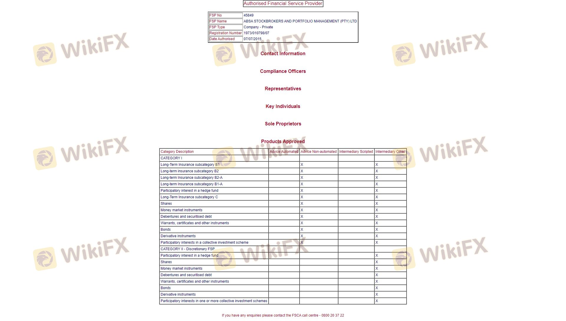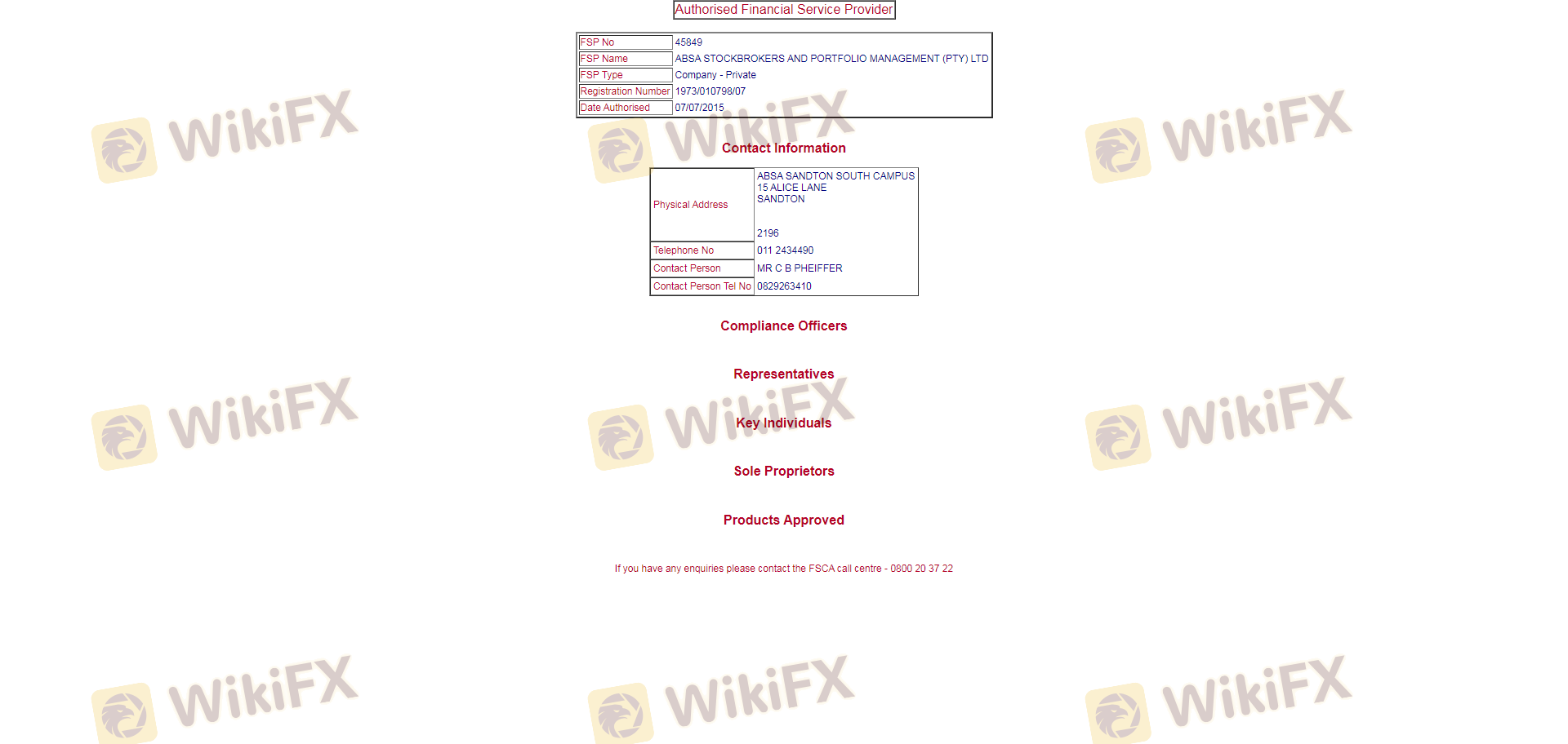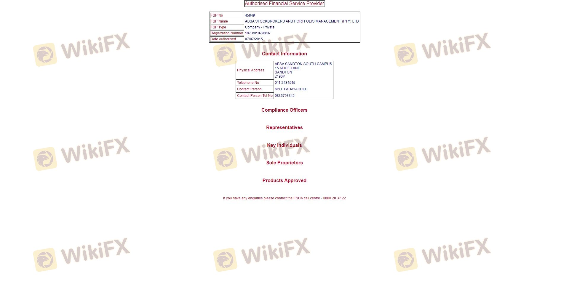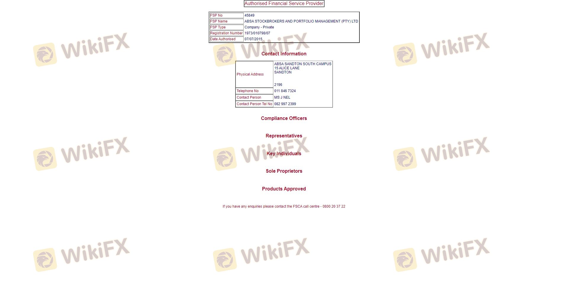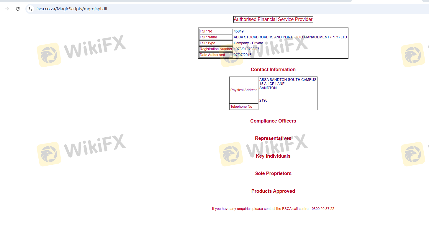 Regulation is a critical aspect of any financial service provider, particularly in the forex trading sector. A well-regulated broker is typically subject to strict oversight, which helps ensure transparency and protect clients' funds. Absa is regulated by the Financial Sector Conduct Authority (FSCA) in South Africa, a reputable regulatory body known for enforcing high standards within the financial industry. Below is a summary of Absa's regulatory information: