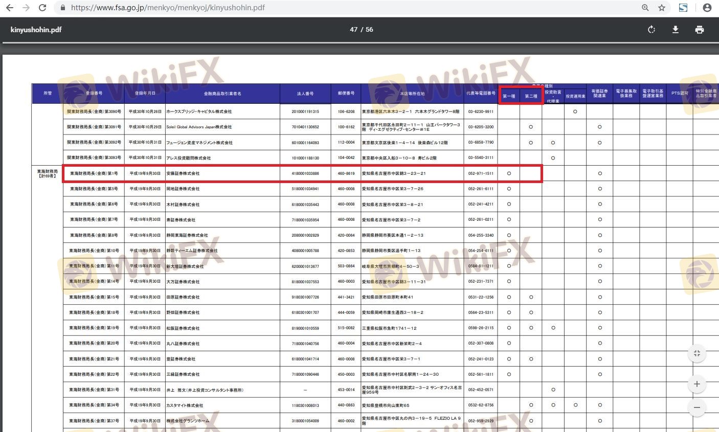 | Financial Services Agency (FSA) | 東海 財務 局長 ( 金 商 ) 第 1 号 | Japan | Active |