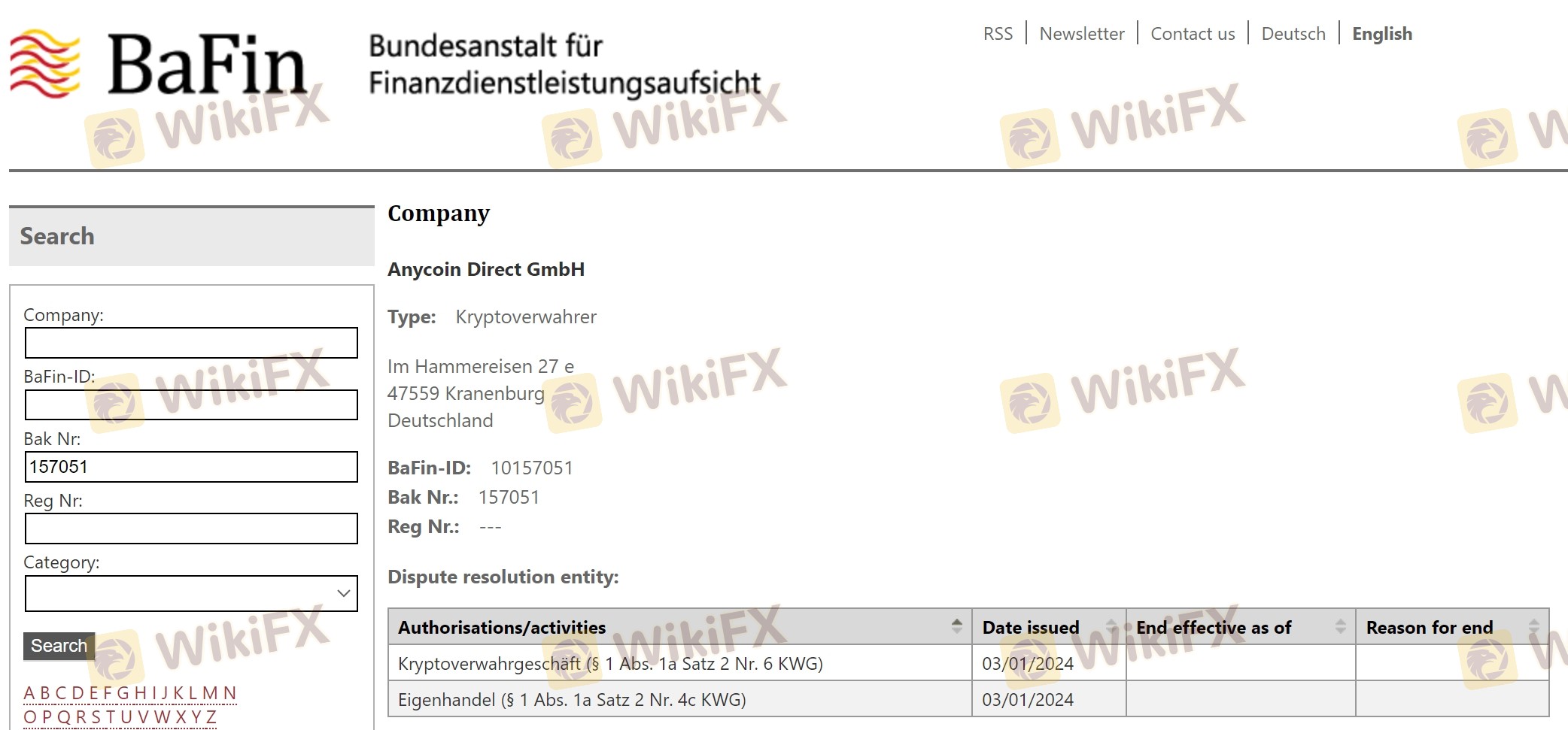 Regarding the legitimacy of Anycoin Direct forex brokers, it provides BaFin and WikiBit, .