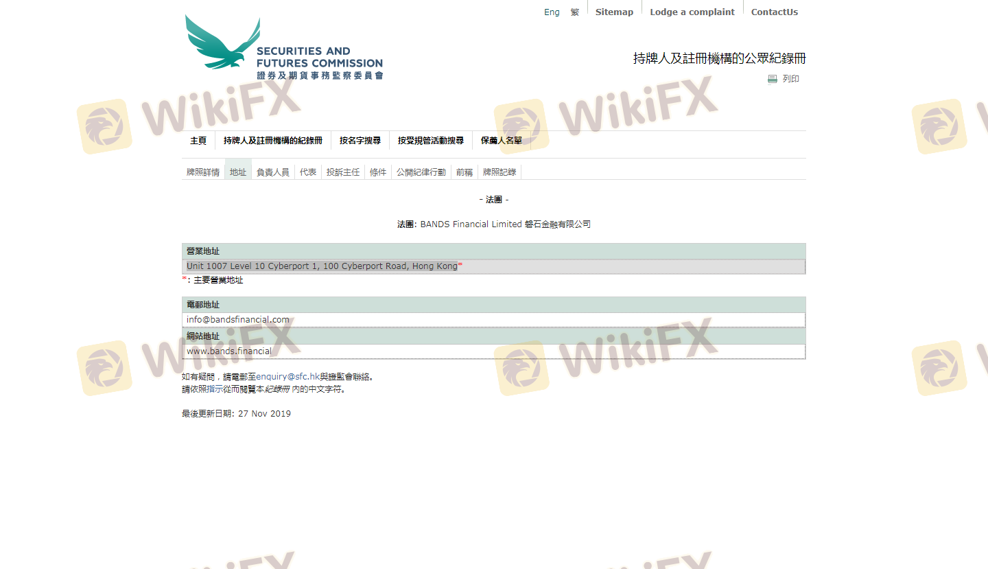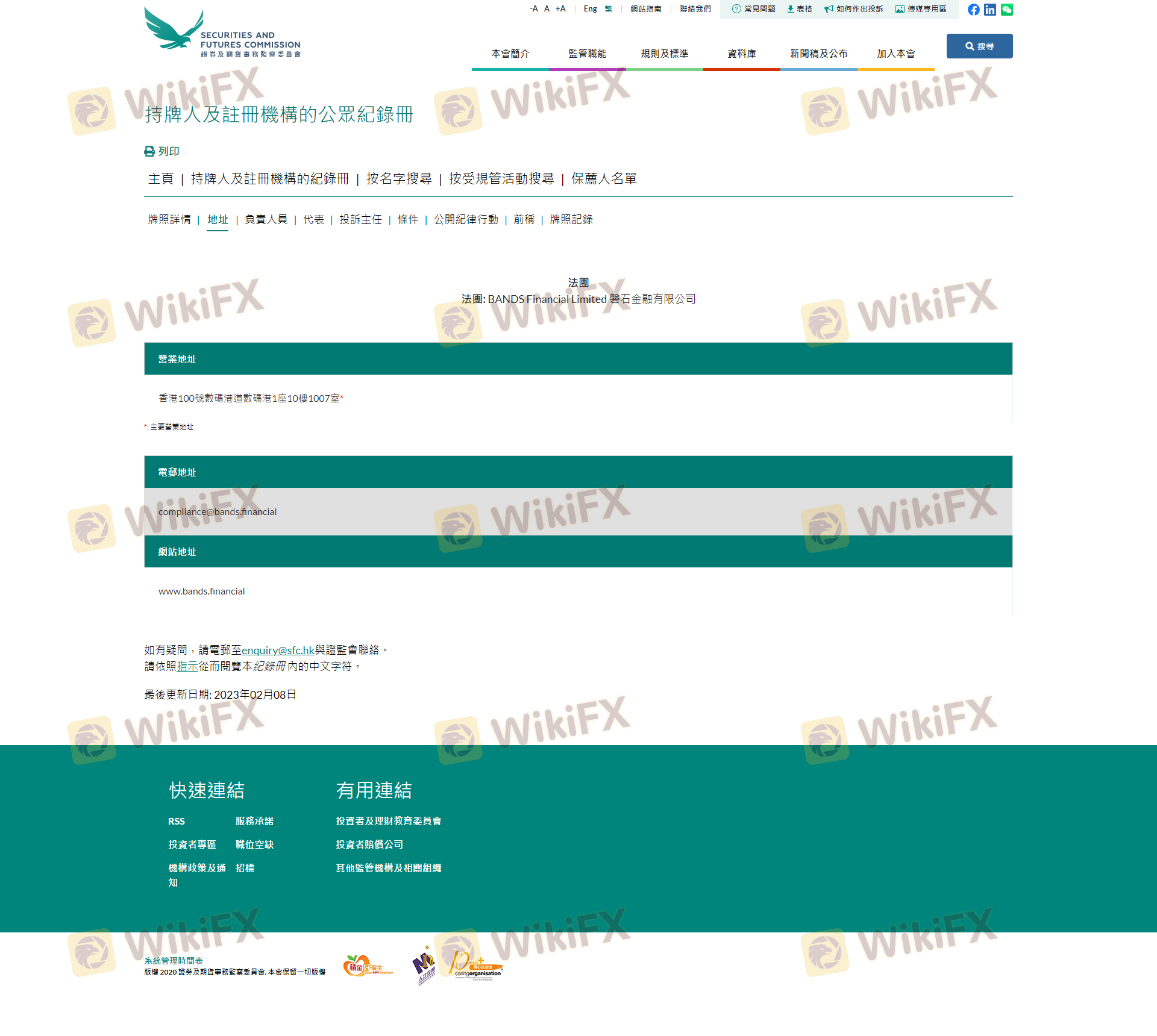 The SFC has been operational since 1989 and is recognized as a reputable regulatory authority. Bands has maintained its license since its establishment in 2015, which adds to its credibility. However, it is worth noting that while regulatory oversight is a positive sign, it does not guarantee complete safety. Traders should still be vigilant and consider other factors such as the broker's historical compliance record and any past disciplinary actions.