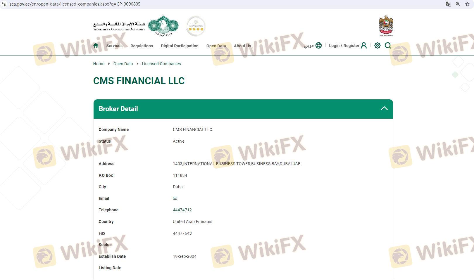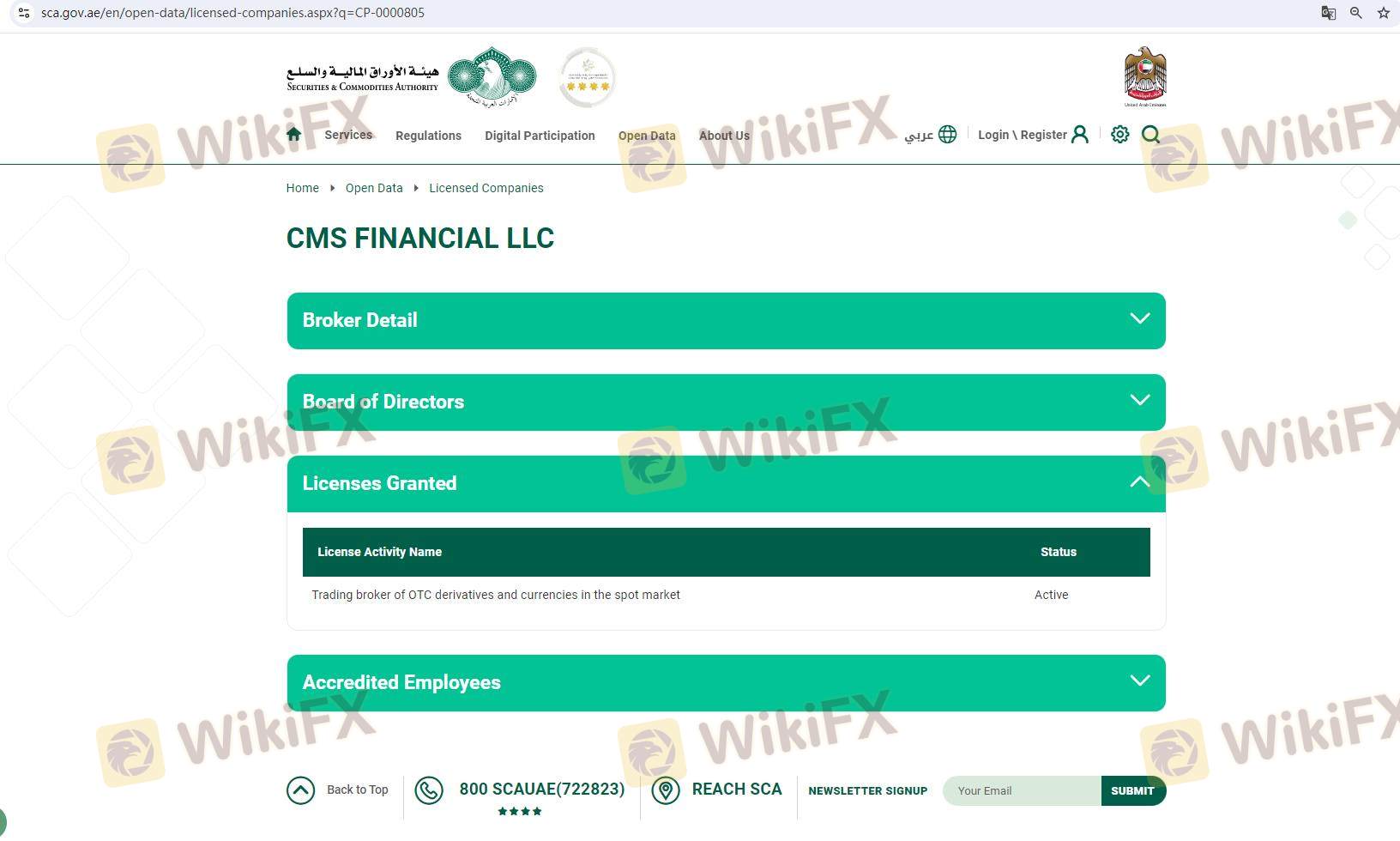 One of the most critical factors in evaluating the safety of any brokerage is its regulatory status. CMS Financial claims to be regulated by the Securities and Commodities Authority (SCA) in the United Arab Emirates, which is a significant regulatory body responsible for overseeing financial markets in the region. The following table summarizes the core regulatory information for CMS Financial: