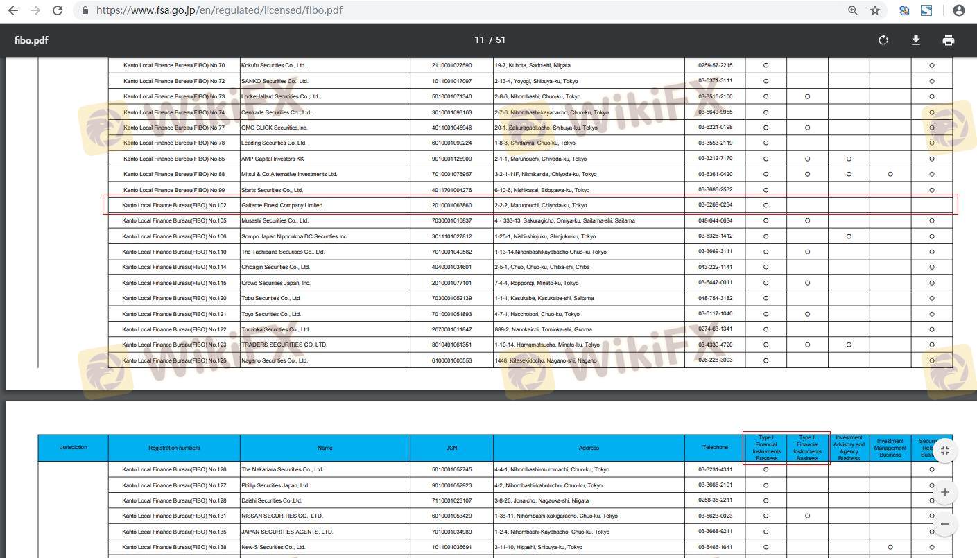 Regulatory oversight is a critical factor in determining the safety and reliability of a forex broker. Gaitame Finest operates under the regulation of the Financial Services Agency (FSA) of Japan, which is known for its stringent regulatory framework. The FSA ensures that brokers adhere to specific standards, thereby protecting traders' interests. Below is a summary of Gaitame Finest's regulatory information: