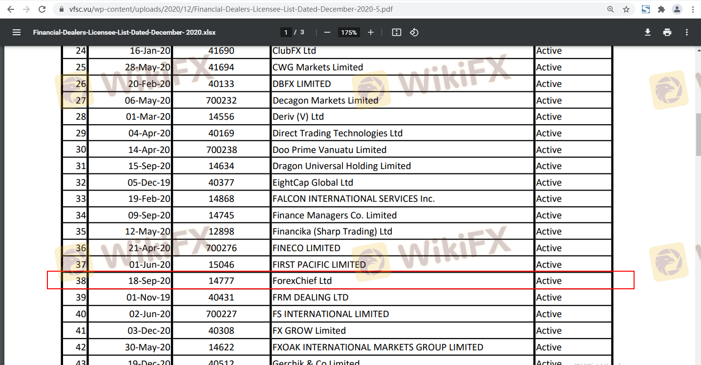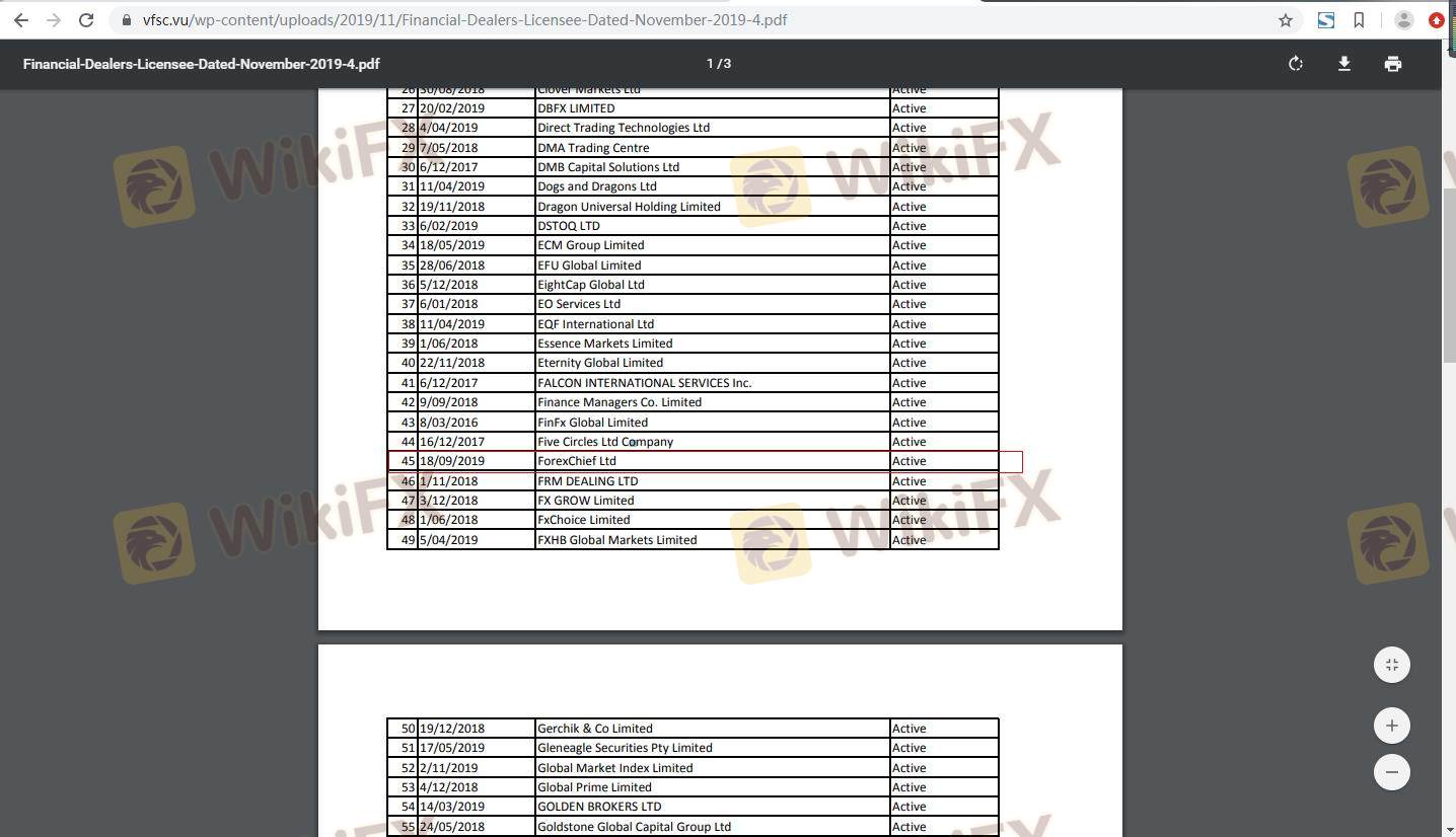 Forexchief operates under the jurisdiction of Vanuatu and is regulated by the Vanuatu Financial Services Commission (VFSC). While the VFSC provides a form of oversight, it is often considered a tier-3 regulator, which means its regulatory standards and investor protections may not be as robust as those offered by more reputable authorities like the FCA or ASIC. Below is a summary of Forexchief's regulatory information: