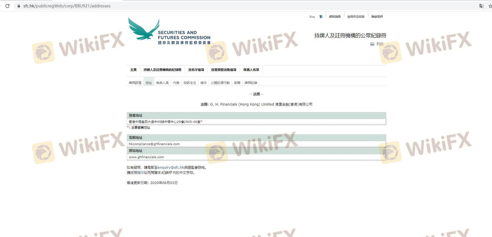 The regulatory framework that governs a forex broker is a critical aspect determining its legitimacy and safety. G. H. Financials is regulated by the Securities and Futures Commission (SFC) in Hong Kong, which is known for its stringent regulatory standards. The firm also holds an investment advisory license from the Financial Conduct Authority (FCA) in the UK. However, there are concerns regarding the scope of its FCA license, which primarily covers investment advisory services rather than direct forex trading.