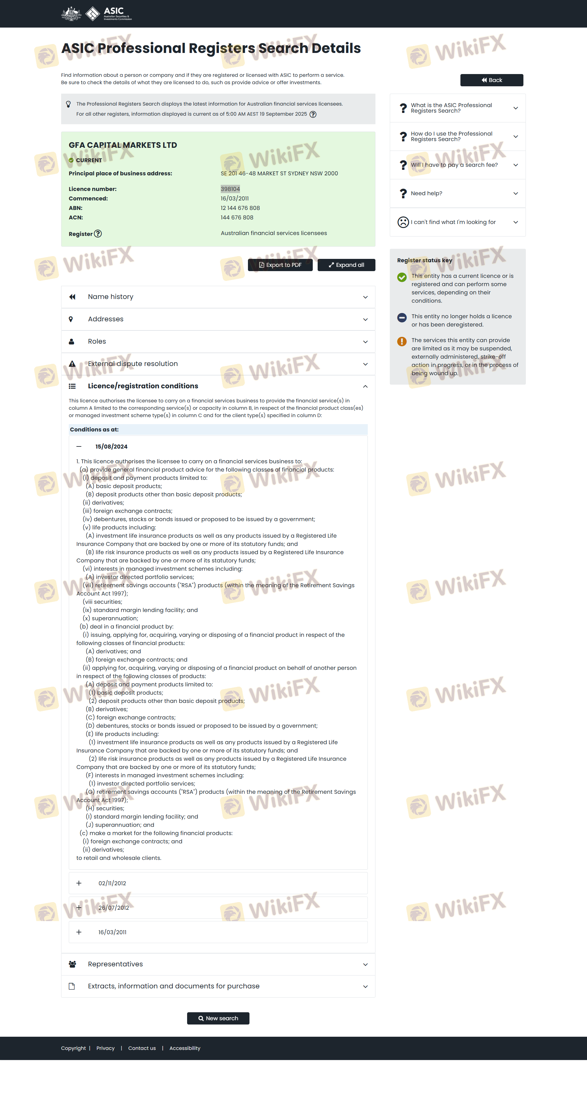 Understanding a broker's regulatory status is crucial for assessing its trustworthiness. Regulation serves as a safeguard for traders, ensuring that brokers adhere to specific standards and practices. GFA claims to be licensed by the Australian Securities and Investments Commission (ASIC). However, there are significant concerns regarding its legitimacy.