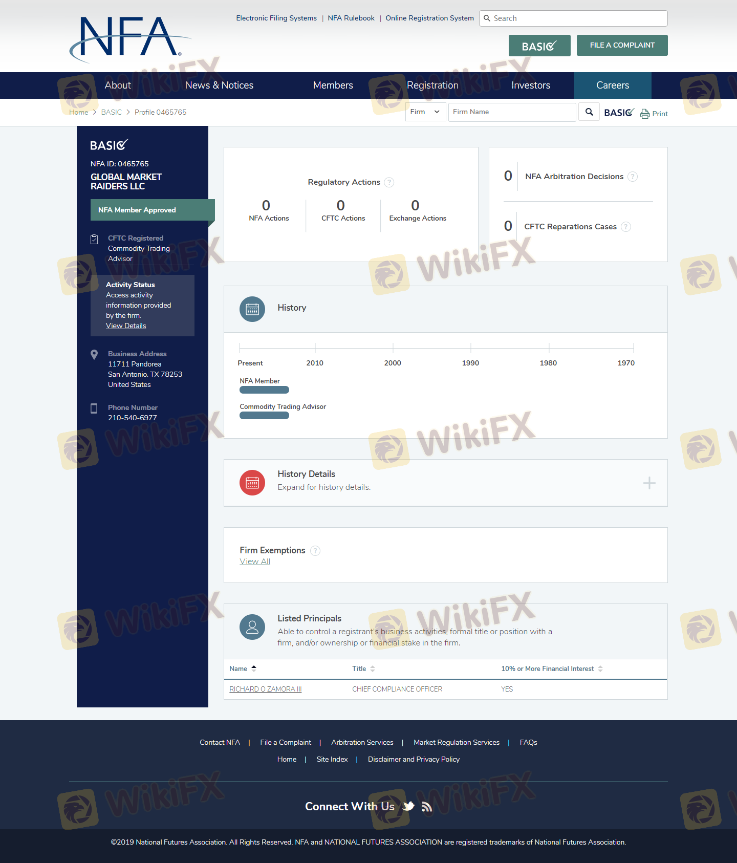 The regulatory status of a forex broker is one of the most critical factors in assessing its legitimacy. GMR is registered with the National Futures Association (NFA) in the United States but operates under a regulatory status termed "exceeded," raising concerns about its compliance with regulatory standards. Below is a summary of GMR's regulatory information: