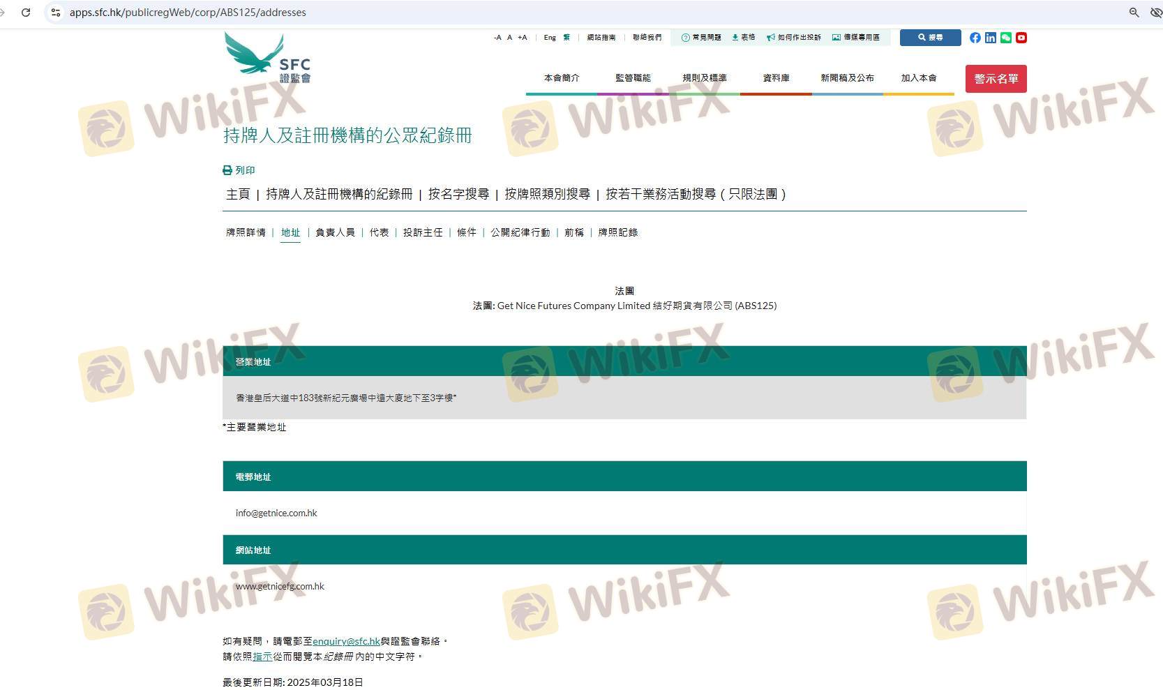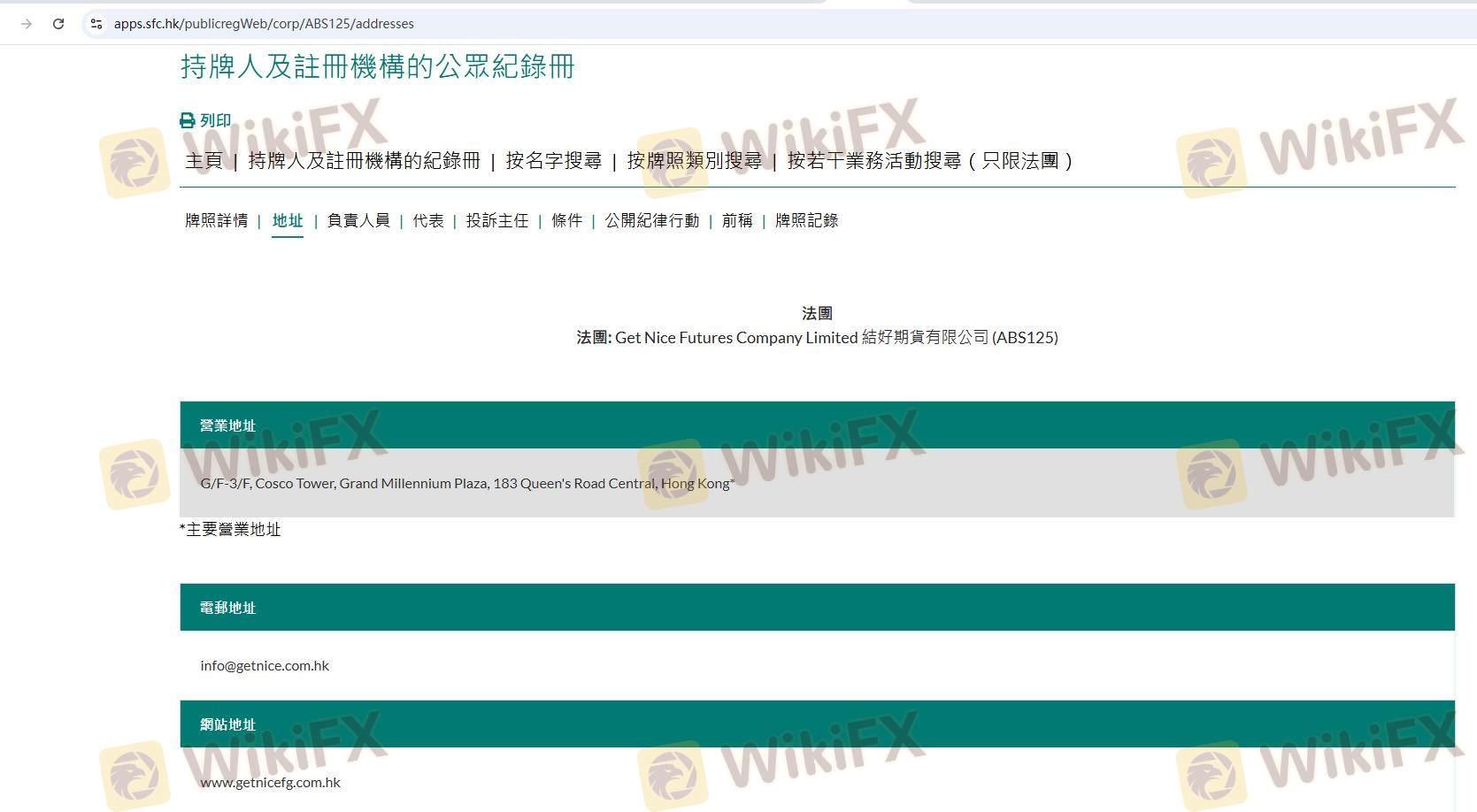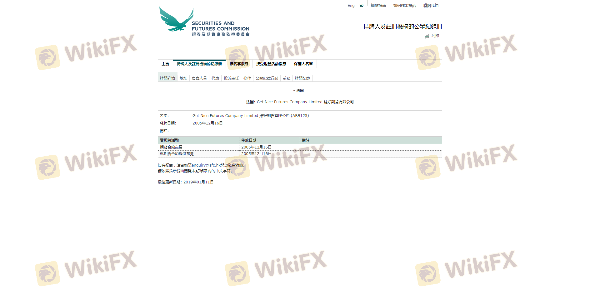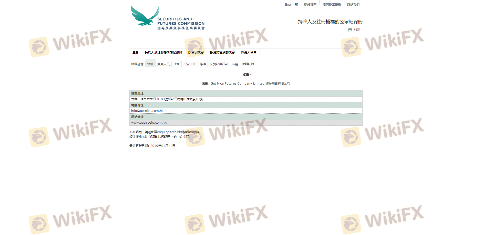 The regulatory status of a brokerage is a key indicator of its legitimacy. Get Nice claims to be regulated by the Securities and Futures Commission (SFC) of Hong Kong, which is a reputable regulatory body. However, the verification of this regulation has been challenging. The following table summarizes the core regulatory information regarding Get Nice: