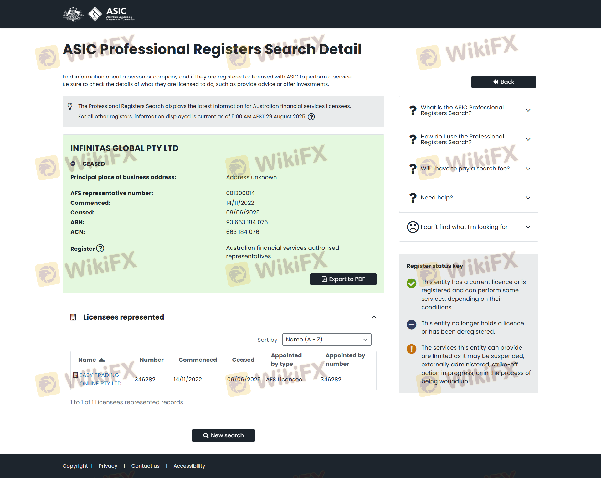 The regulatory environment is a primary indicator of a broker's legitimacy. INF claims to be regulated by the Australian Securities and Investments Commission (ASIC), a well-respected financial authority known for its stringent oversight of financial markets. Regulation by ASIC implies that the broker adheres to high standards of financial practice, which is a positive aspect for potential traders. The following table summarizes the core regulatory information for INF: