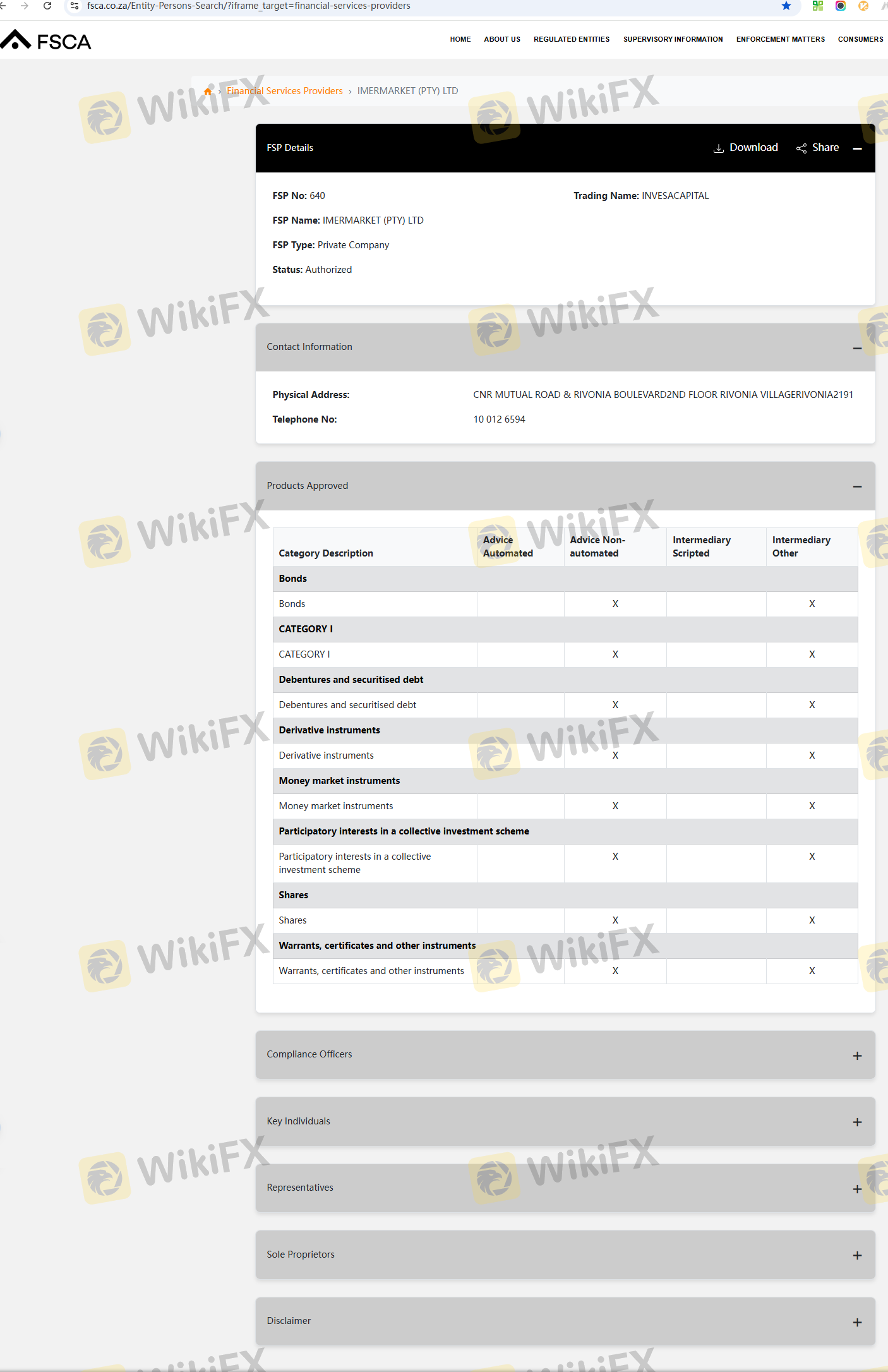 Regulation is a crucial factor when assessing the credibility of a forex broker. A regulated broker is subject to oversight by financial authorities, which can provide a level of assurance regarding the broker's operations and the safety of client funds. InvesaCapital claims to operate under the auspices of Imer Market (Pty) Ltd, purportedly regulated by the Financial Sector Conduct Authority (FSCA) in South Africa. However, the legitimacy of these claims is questionable.