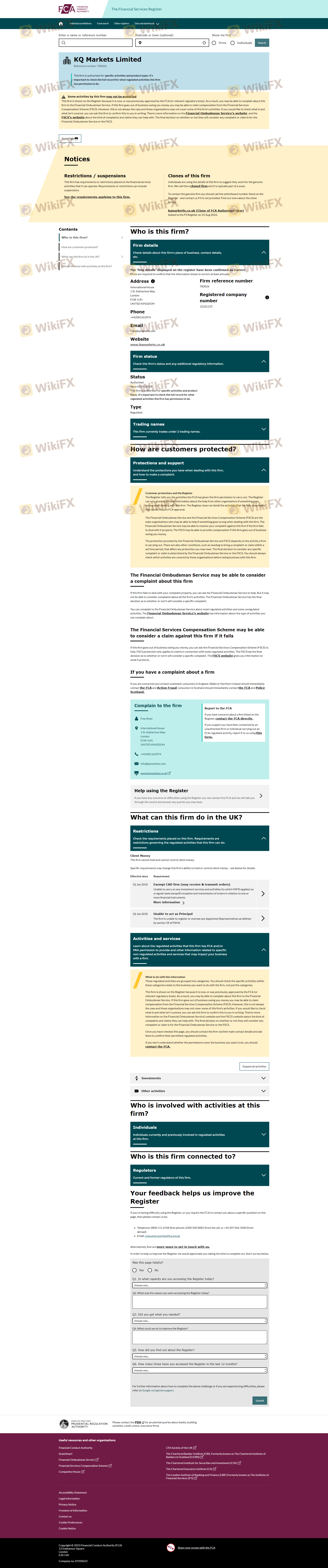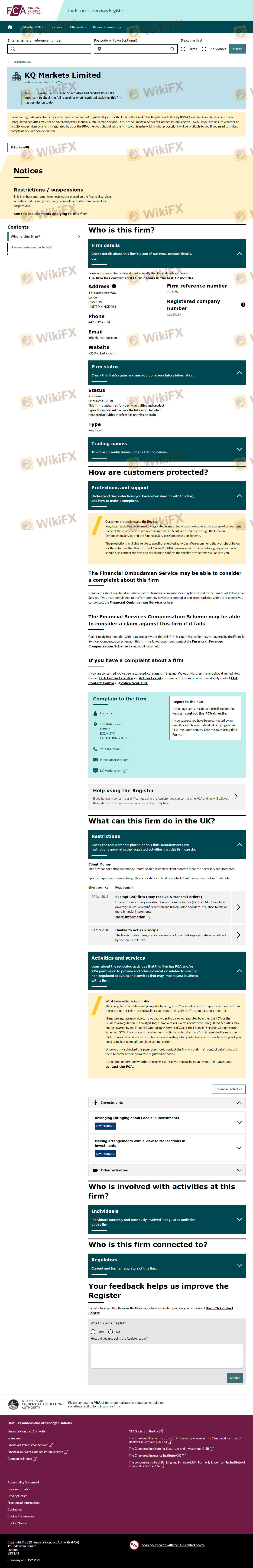 KQ Markets claims to be regulated by the Financial Conduct Authority (FCA) in the UK. However, it is important to note that the FCA has flagged KQ Markets as an "exceeded" entity, indicating that it may not be fully compliant with the required regulatory standards. This raises significant concerns regarding the broker's operational legitimacy. The FCA is known for its rigorous regulatory framework, which includes requirements for capital adequacy, transparency, and client protection. Brokers that fail to meet these standards may pose a higher risk to traders, as they are not subject to the same oversight and accountability measures.