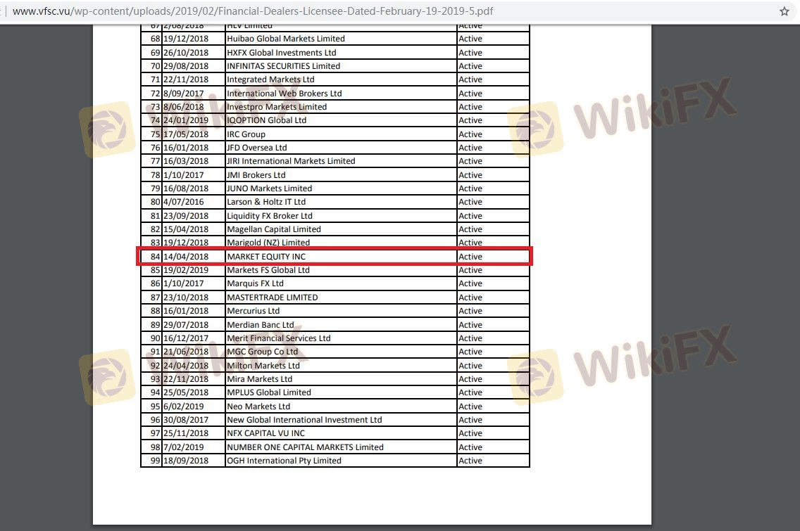 Regarding the legitimacy of Market Equity forex brokers, it provides VFSC and WikiBit, .