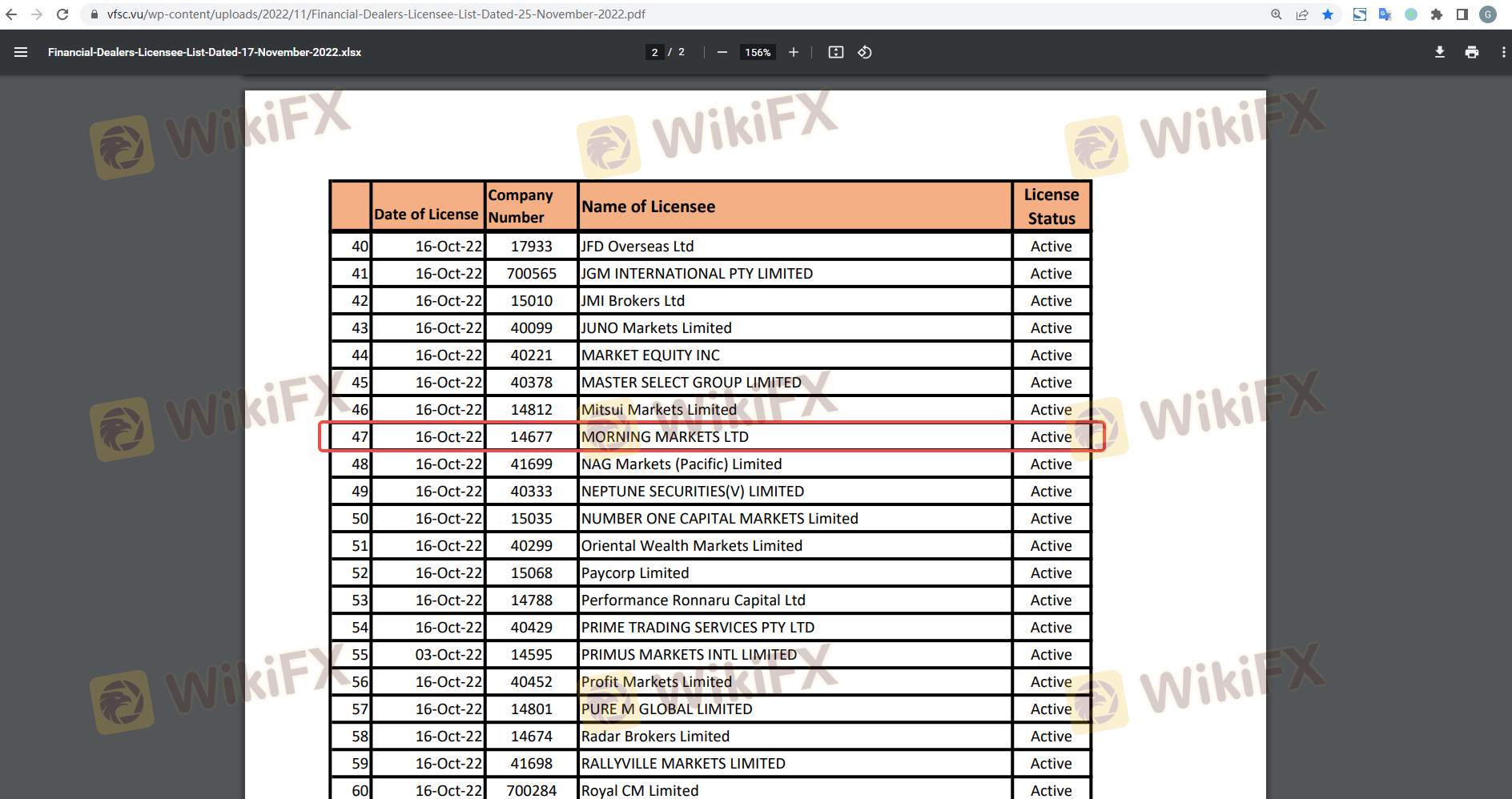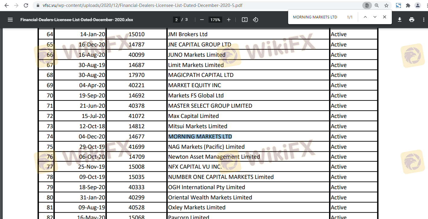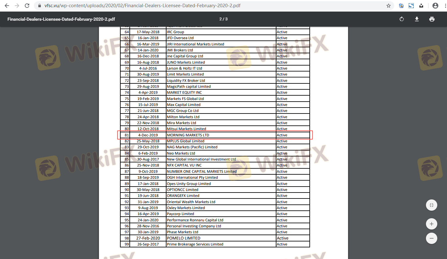 Regarding the legitimacy of morningfx forex brokers, it provides VFSC and WikiBit, .