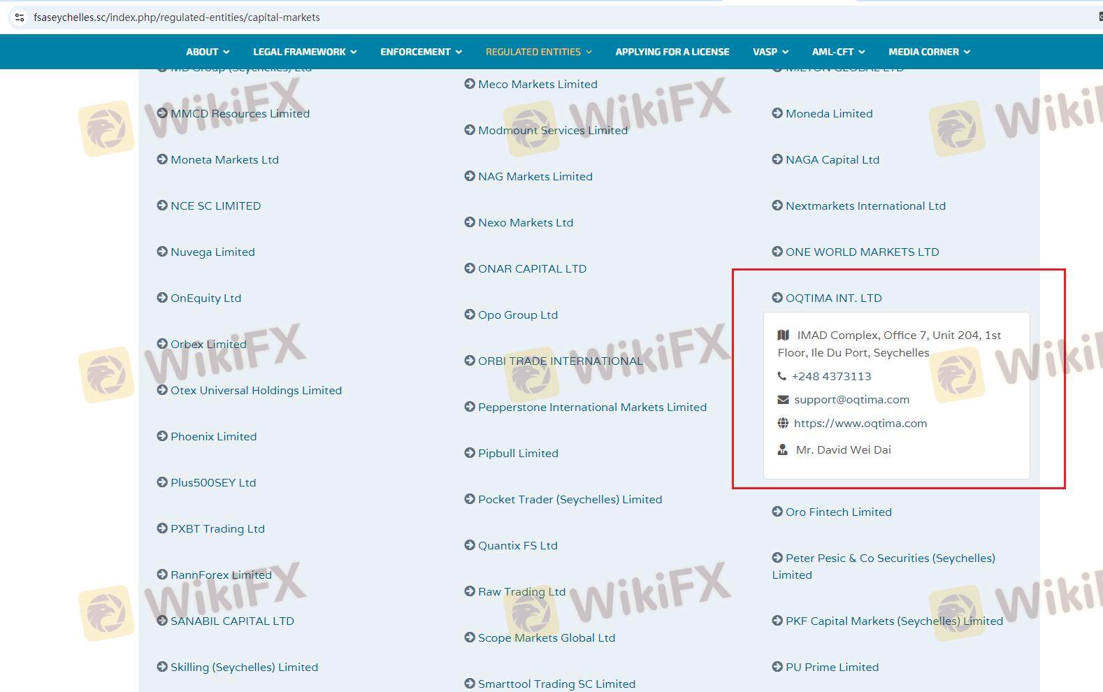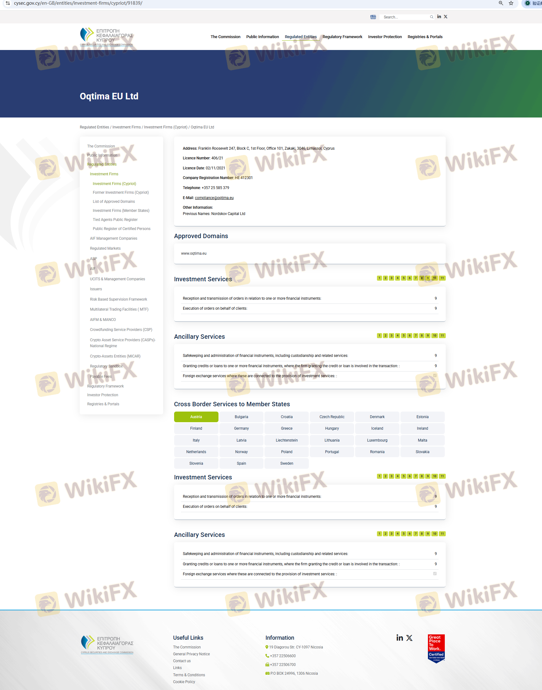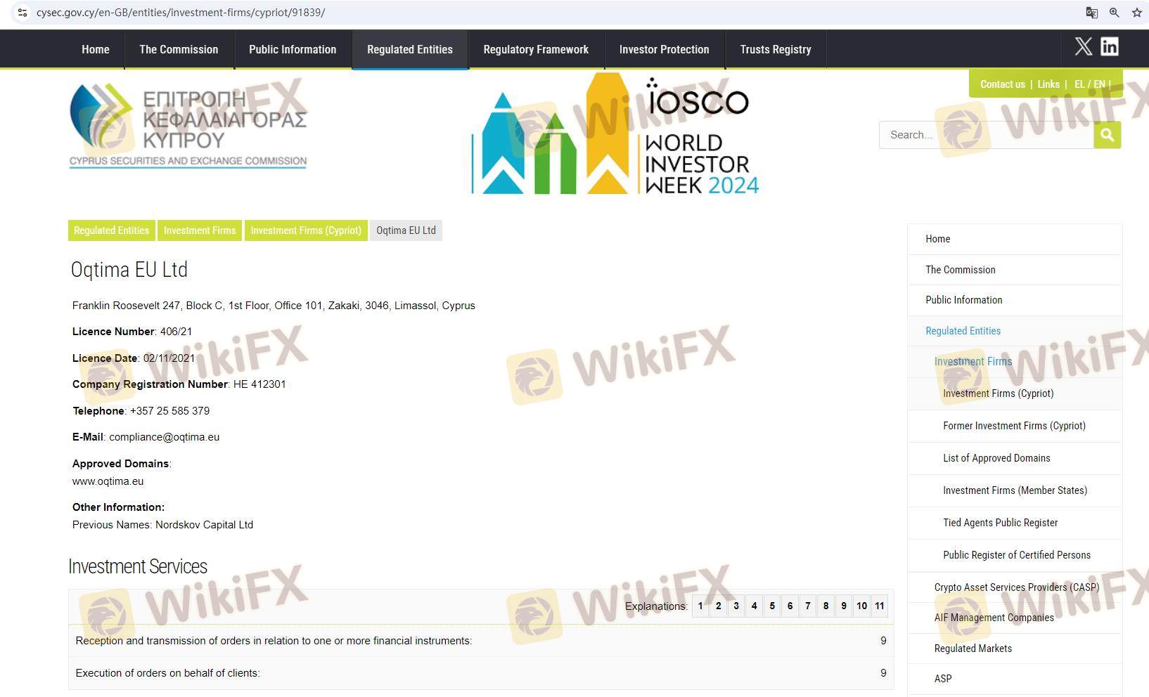 The regulatory status of a broker is a critical factor in determining its legitimacy and trustworthiness. Oqtima operates under the oversight of two regulatory bodies: the Cyprus Securities and Exchange Commission (CySEC) and the Financial Services Authority (FSA) in Seychelles. CySEC is recognized as a tier-1 regulator, providing robust investor protection, while the FSA is considered a tier-3 regulator, offering more lenient oversight.