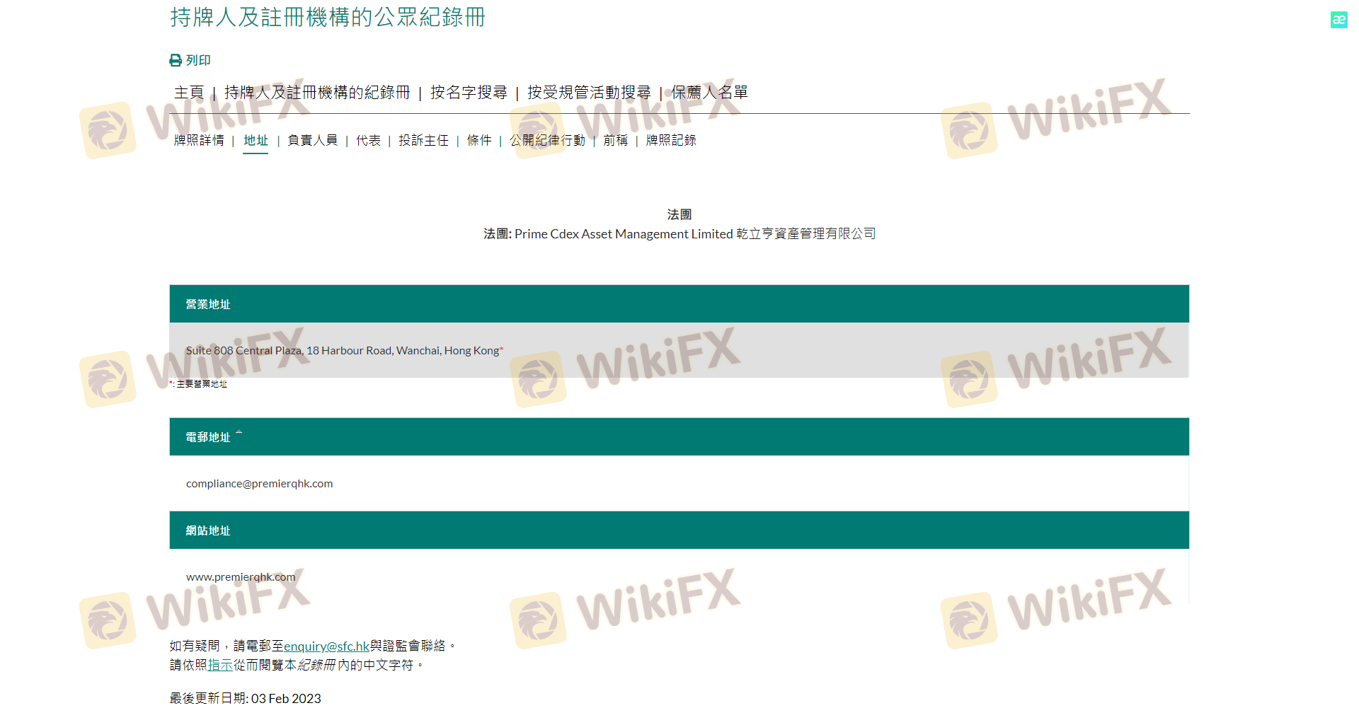 The regulatory status of a forex broker is a critical factor in determining its legitimacy and safety for traders. Prime CDEX is regulated by the Securities and Futures Commission (SFC) of Hong Kong, which is a reputable regulatory body known for its stringent oversight of financial institutions. However, it is essential to note that while Prime CDEX holds licenses for dealing in futures contracts, its licenses for dealing in securities and asset management have expired, raising concerns about its operational legitimacy.