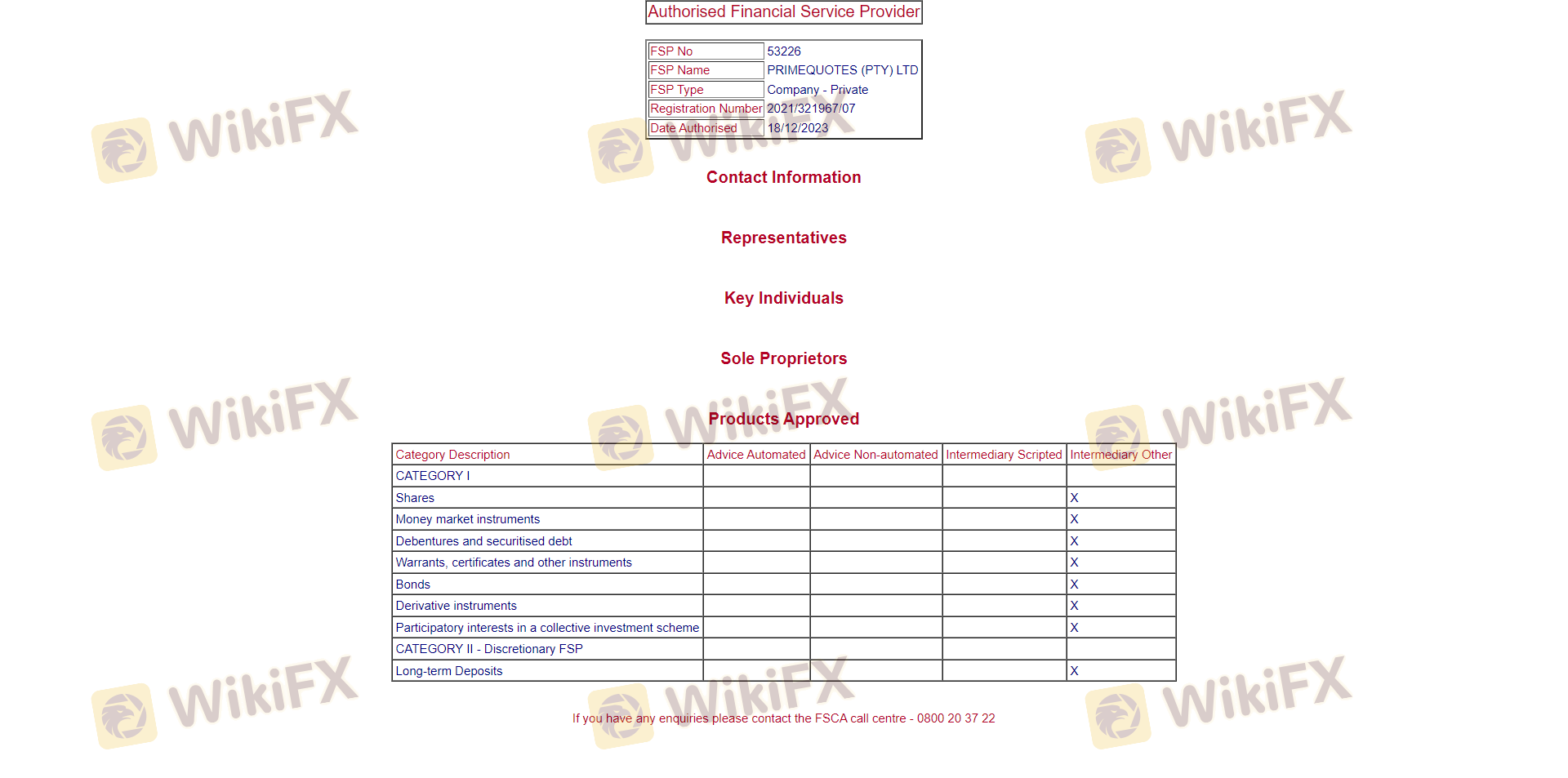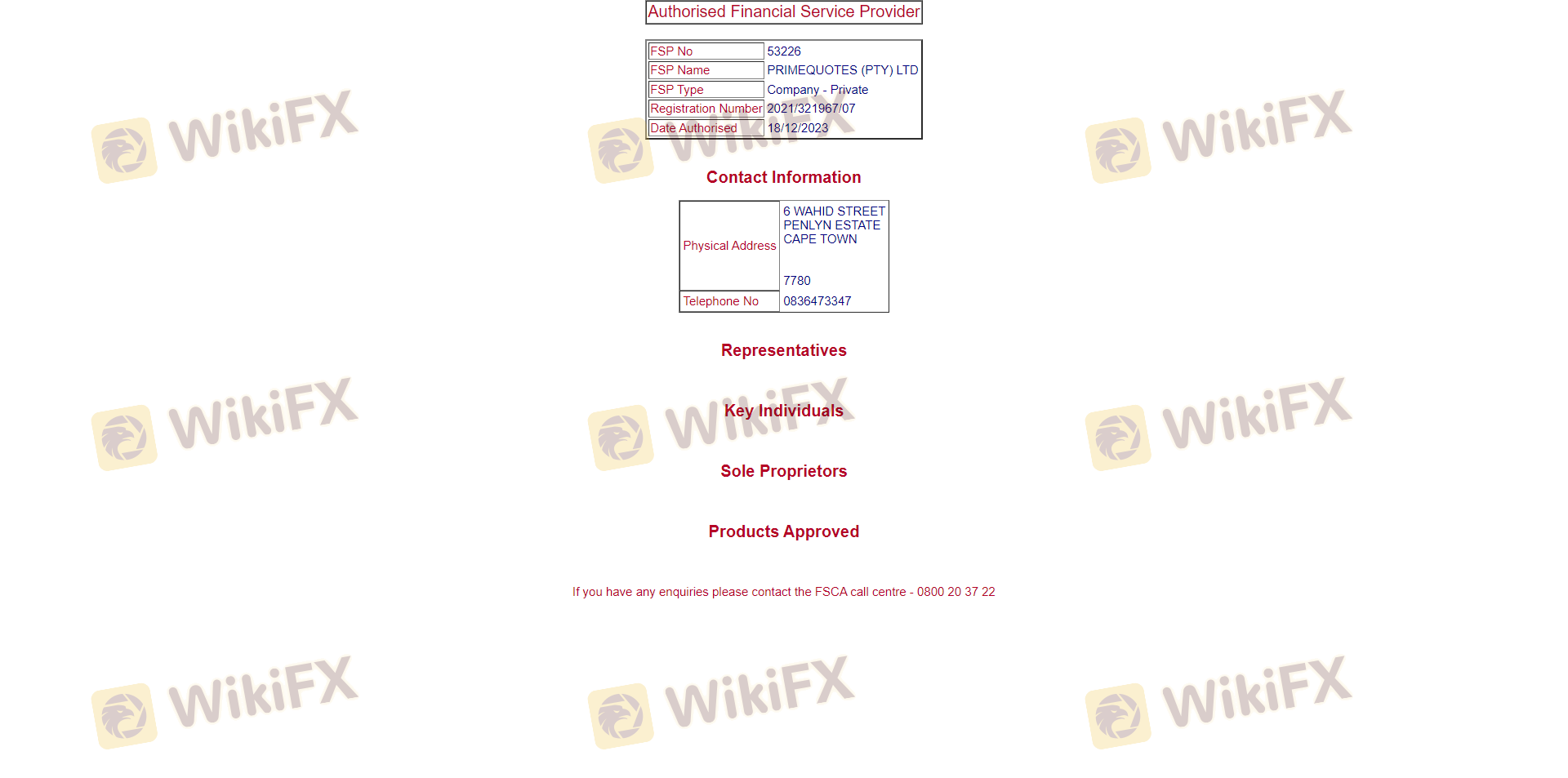 One of the most critical factors in assessing the safety of any forex broker is its regulatory status. PrimeQuotes claims to hold a financial service corporate license from the Financial Sector Conduct Authority (FSCA) in South Africa. However, it's important to note that its forex trading services fall outside the authorized scope of this license. This effectively means that PrimeQuotes operates in an unregulated environment, which raises significant concerns regarding investor protection and fund security.