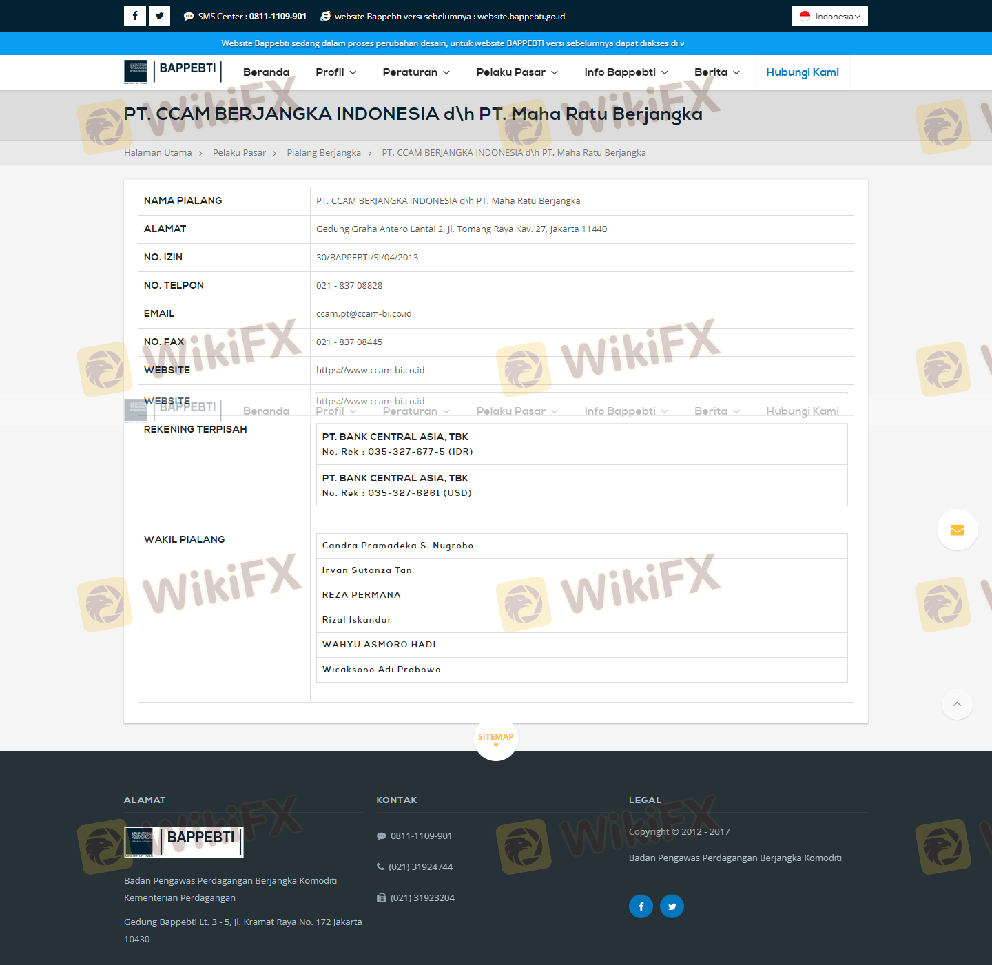 Regarding the legitimacy of PT.CCAM forex brokers, it provides BAPPEBTI and WikiBit, (also has a graphic survey regarding security).