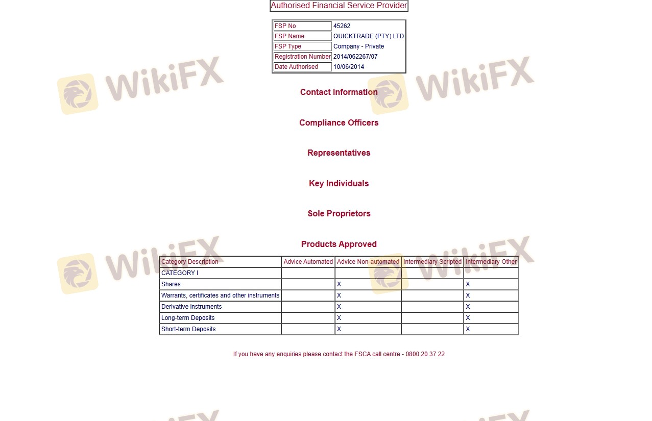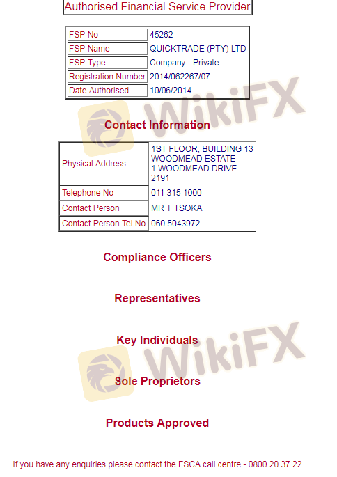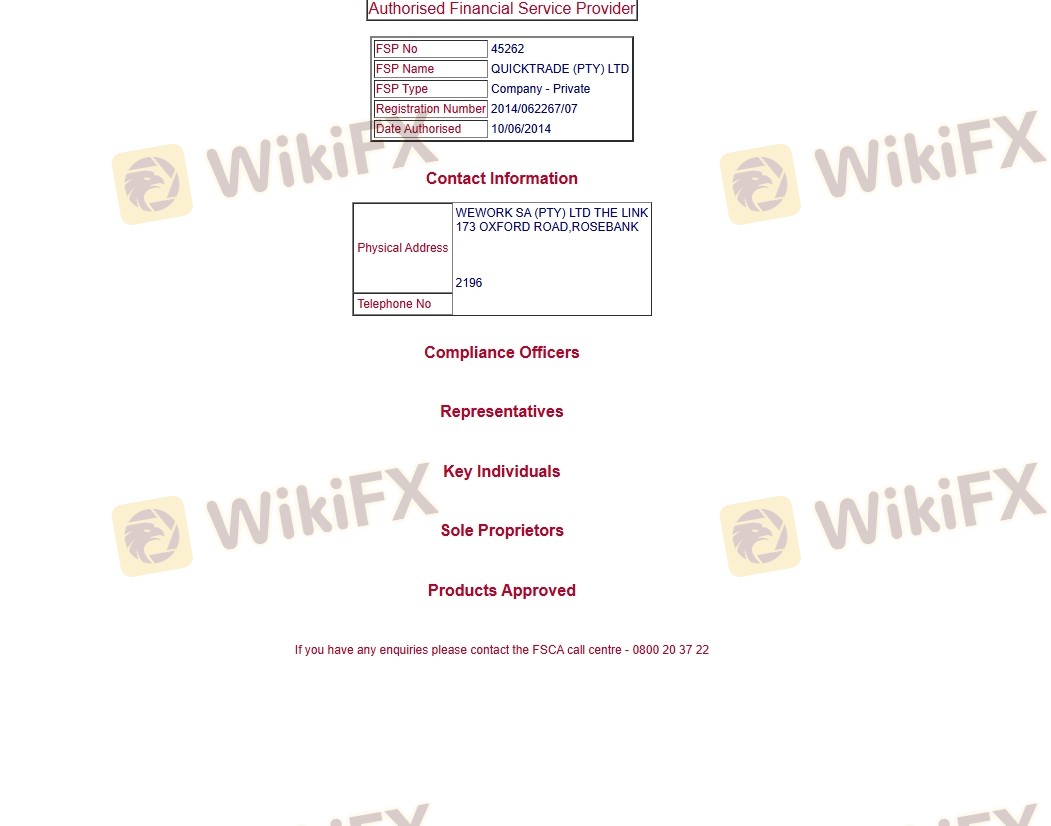 Understanding a broker's regulatory status is crucial for determining its legitimacy and reliability. QuickTrade is regulated by the Financial Sector Conduct Authority (FSCA) of South Africa, which is known for its oversight of financial institutions in the country. The FSCA aims to enhance the integrity and efficiency of the financial markets, providing a level of protection for investors. Below is a summary of QuickTrade's regulatory information: