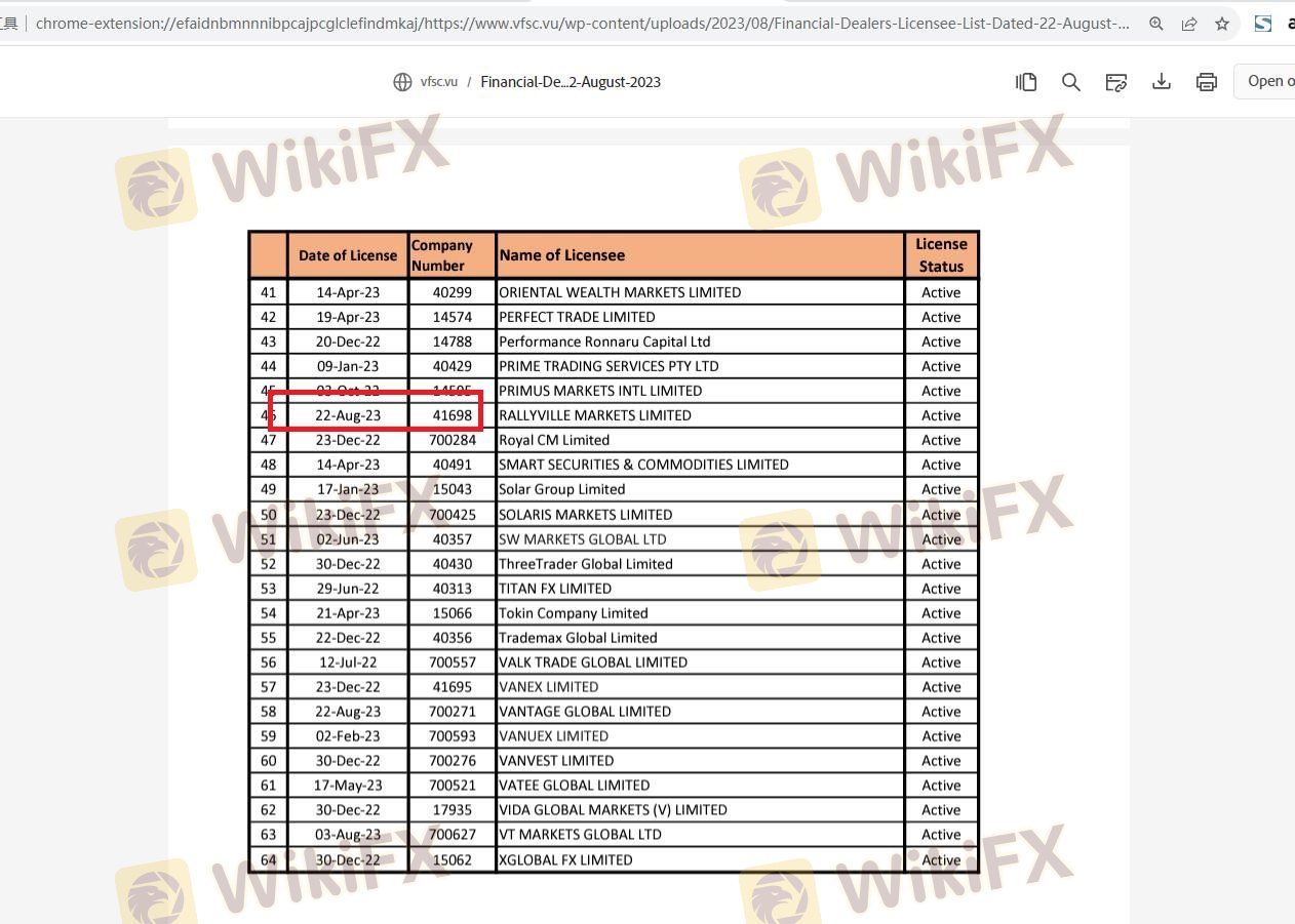 Rallyville Markets is owned by Rallyville Markets Limited, which is registered in Vanuatu. The broker's establishment in 2021 means it is relatively new in the forex market, which may pose risks for traders seeking stability and a proven track record. The management team behind Rallyville Markets has not been prominently featured in available documentation, raising questions about their experience and expertise in the financial sector.