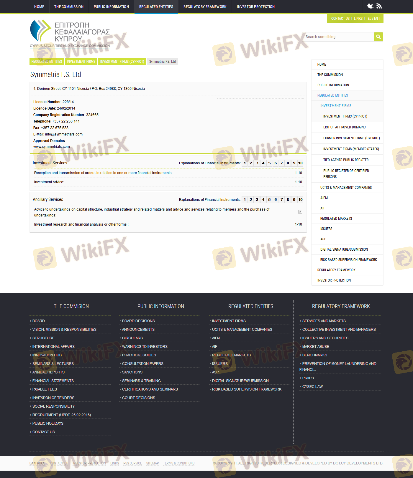 The regulatory framework surrounding Forex brokers is essential for ensuring the safety of traders' funds and the integrity of trading practices. Symmetria operates under the auspices of the Cyprus Securities and Exchange Commission (CySEC), which is known for its stringent regulatory requirements. Below is a summary of Symmetria's regulatory information: