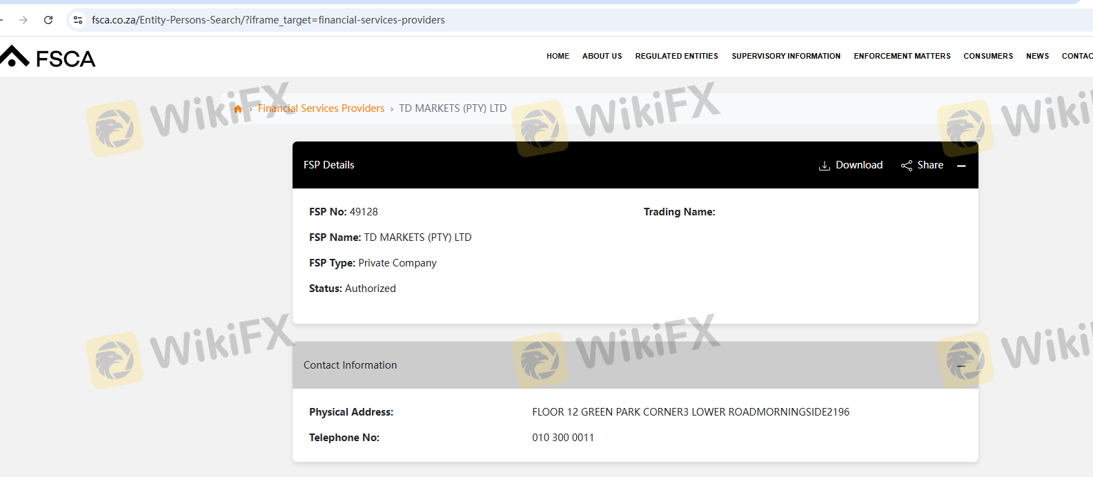 The regulatory status of a broker is a critical factor in determining its safety and trustworthiness. TD Markets claims to be regulated by the Financial Sector Conduct Authority (FSCA) in South Africa, which is known for enforcing strict compliance standards. However, there are concerns regarding the validity of this claim, as some sources indicate that TD Markets operates under an offshore license from the Financial Services Authority of Saint Vincent and the Grenadines, which is often viewed as a less credible regulatory framework.