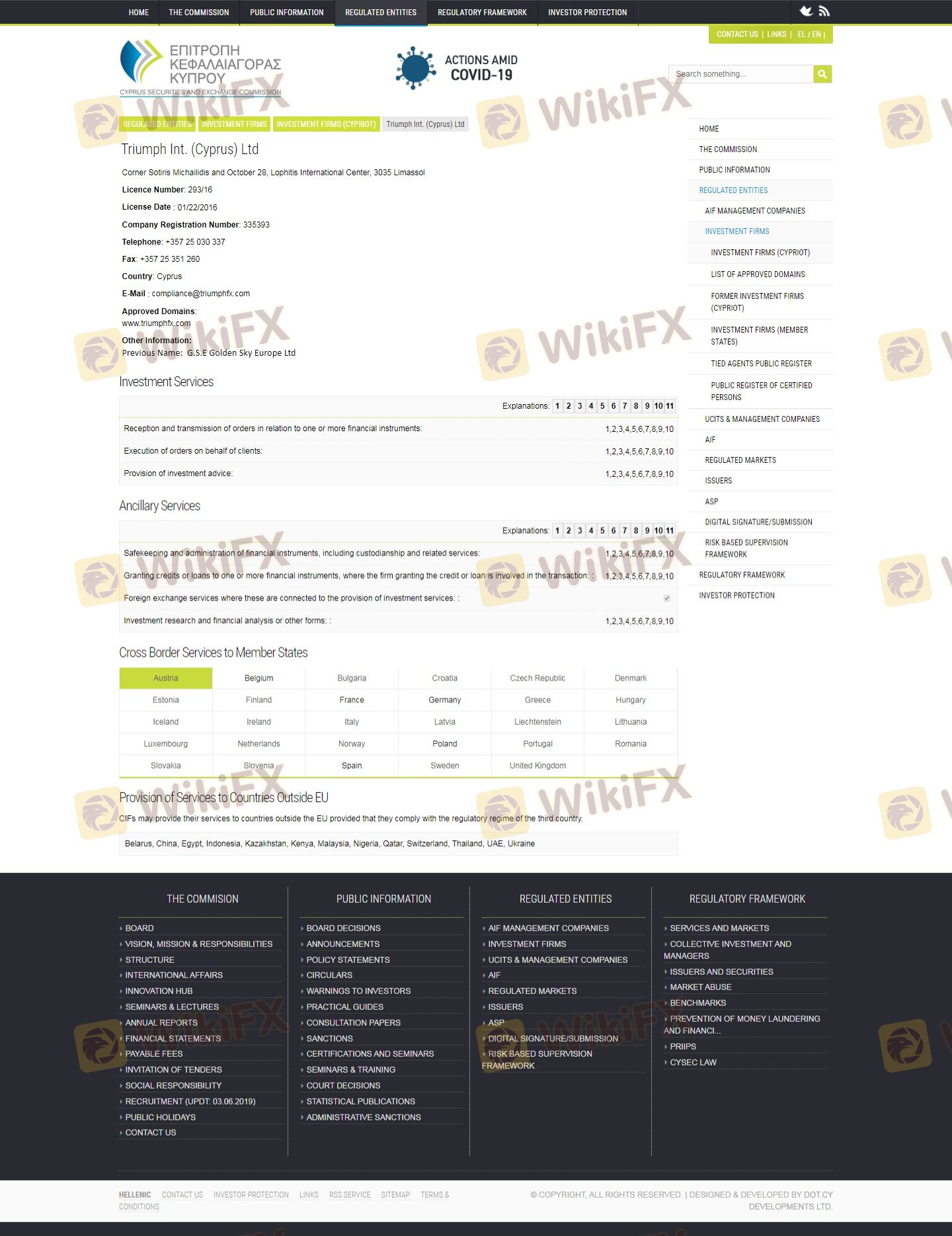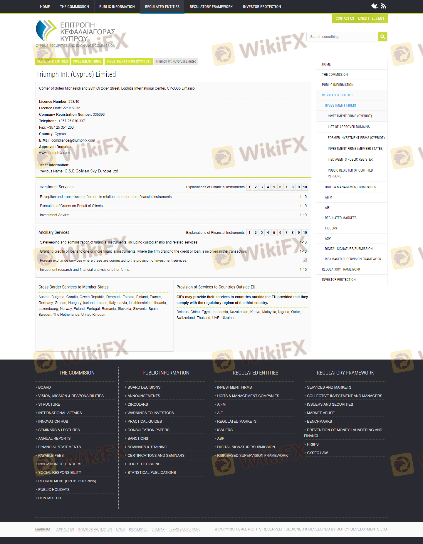TriumphFX is primarily regulated by CySEC, a reputable authority known for its stringent regulatory standards within the European Union. This licensing ensures that TriumphFX adheres to the European Markets in Financial Instruments Directive (MiFID), which provides essential protections for investors, including the segregation of client funds and participation in an investor compensation scheme.