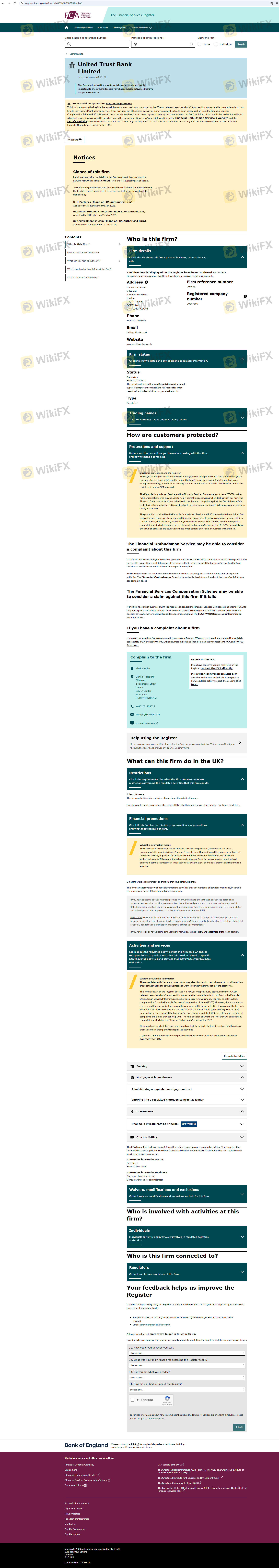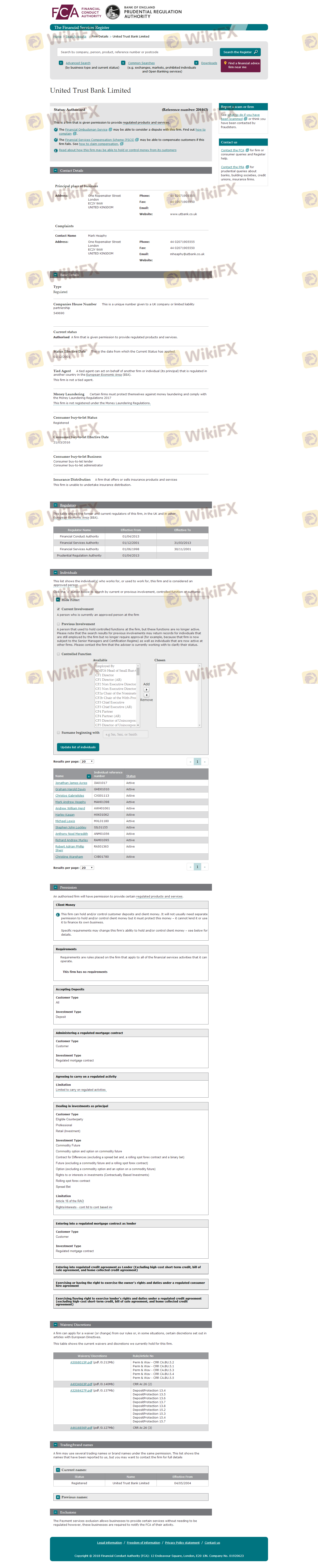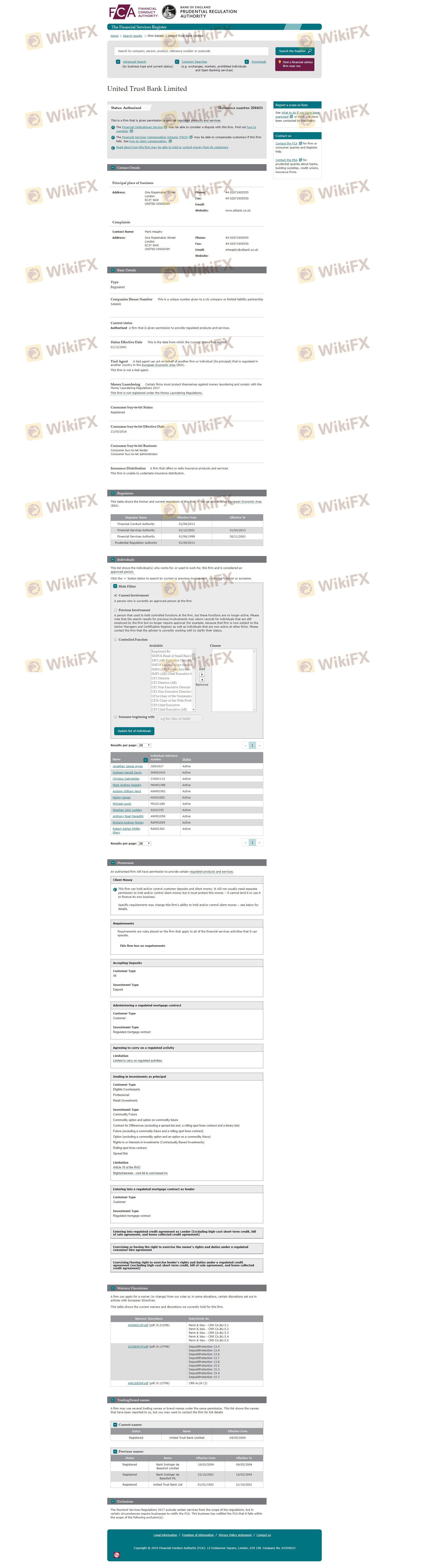 Understanding the regulatory framework governing a broker is essential for evaluating its safety and legitimacy. United Trust Bank is regulated by the Financial Conduct Authority (FCA) in the UK, which is considered one of the most stringent regulatory bodies globally. Regulation by the FCA ensures that brokers adhere to strict guidelines designed to protect clients and maintain market integrity. Below is a summary of the regulatory information for United Trust Bank: