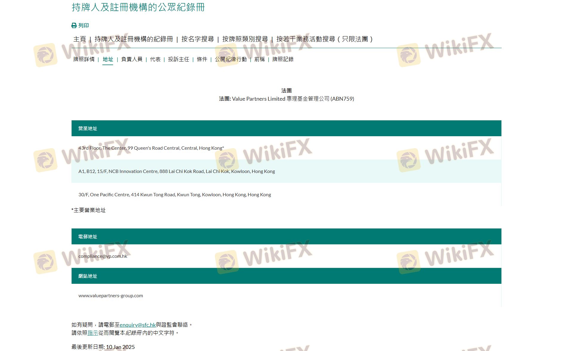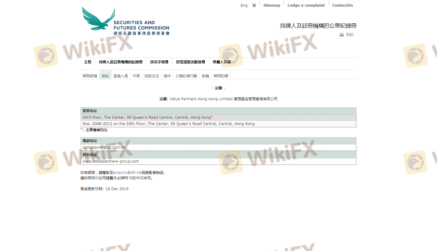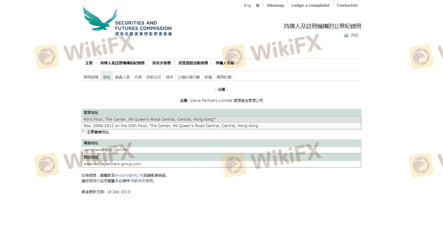 One of the most critical aspects of evaluating any forex broker is its regulatory status. Value Partners Group is regulated by the Securities and Futures Commission (SFC) of Hong Kong, which is known for its stringent oversight of financial institutions. Regulation serves as a safety net for investors, ensuring that the broker adheres to high standards of financial conduct. Here is a summary of the regulatory information for Value Partners Group: