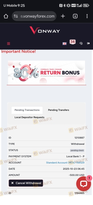 Moreover, the absence of a robust investor protection scheme raises concerns about the safety of funds deposited with Vonway. Regulatory bodies typically enforce strict requirements for fund management, ensuring that brokers maintain sufficient capital reserves and adhere to best practices in fund handling. In Vonway's case, the lack of such oversight means that traders have limited recourse if issues arise regarding fund mismanagement or withdrawal difficulties.