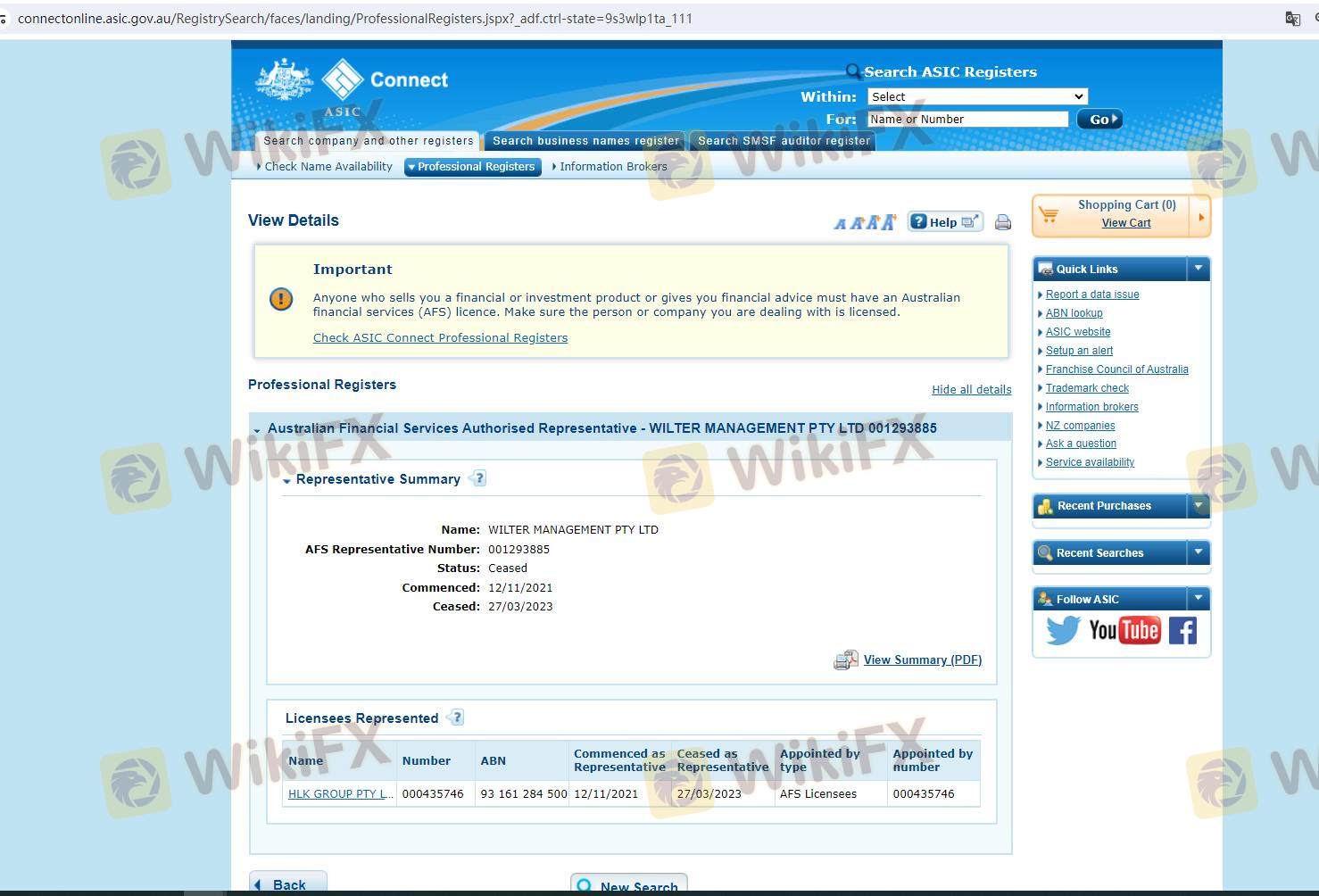 The regulatory status of a broker is a critical factor in determining its legitimacy and safety. Wilter operates under an appointed representative (AR) license authorized by the Australian Securities and Investments Commission (ASIC). This regulatory body is known for its stringent requirements, which adds a layer of credibility to the broker.