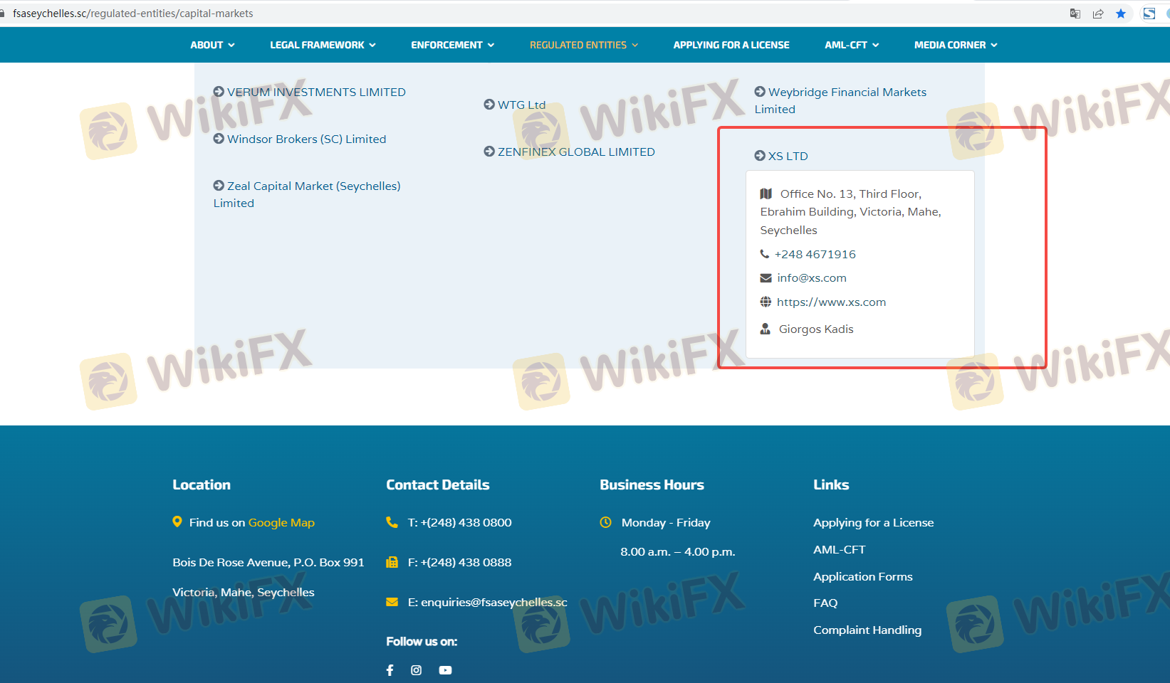 The regulatory status of a broker is paramount in determining its legitimacy and safety. XS operates under several regulatory authorities, which is a positive indicator of its compliance with industry standards. The following table summarizes XS's core regulatory information: