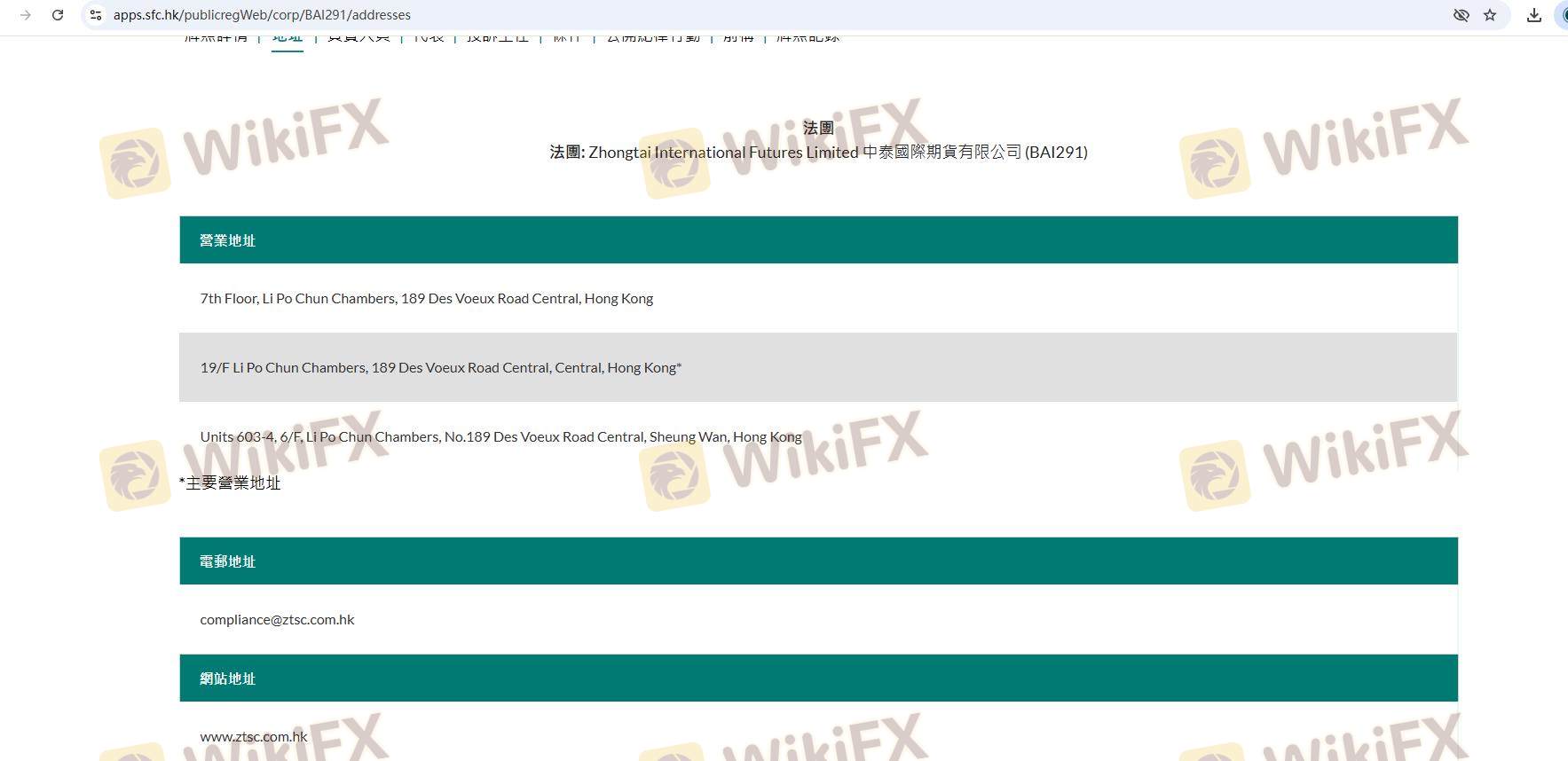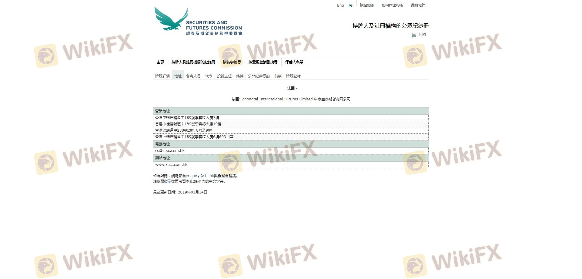 The regulatory status of a forex broker is one of the most critical factors in determining its safety. Zhongtai International is regulated by the Securities and Futures Commission (SFC) of Hong Kong, which is known for its stringent regulatory framework. This oversight is essential for maintaining market integrity and protecting investors. Below is a summary of Zhongtai International's regulatory information: