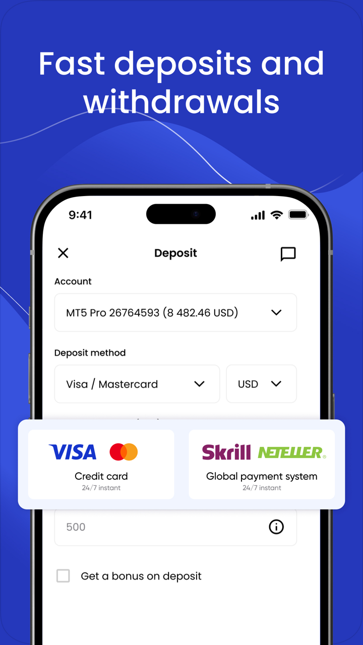 - Múltiples Métodos de Financiación: Deposite y retire fondos directamente dentro de la aplicación.