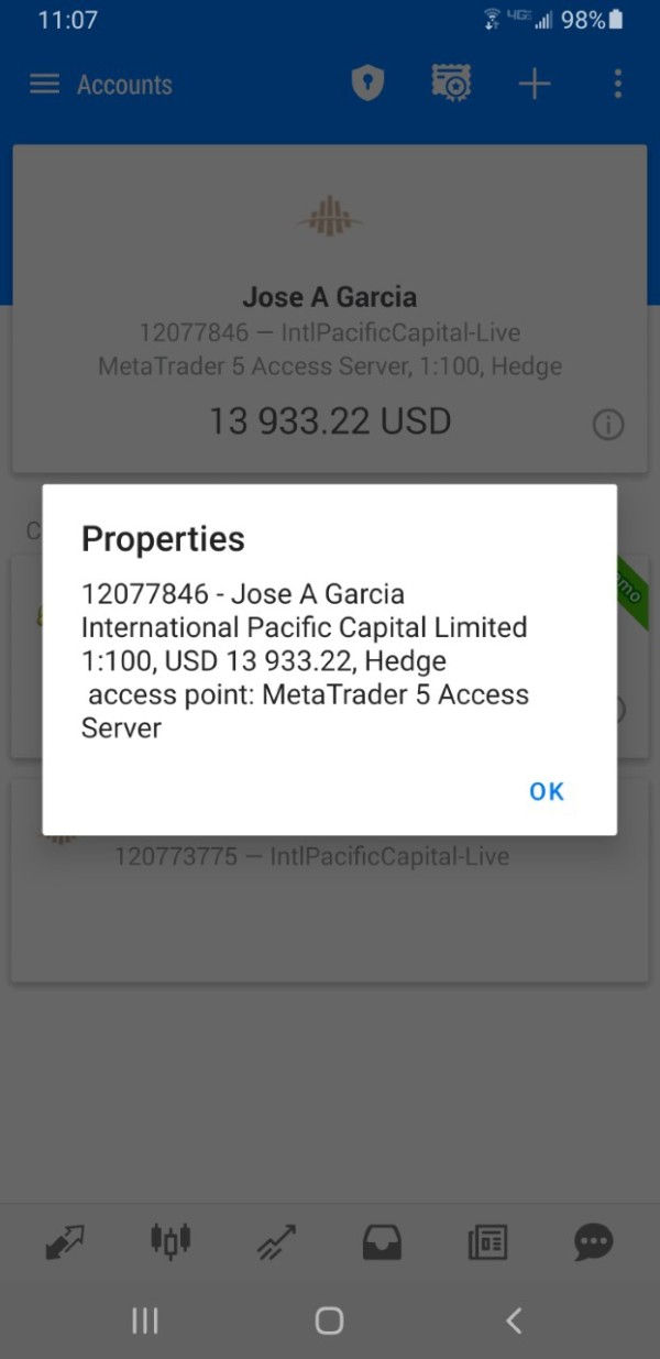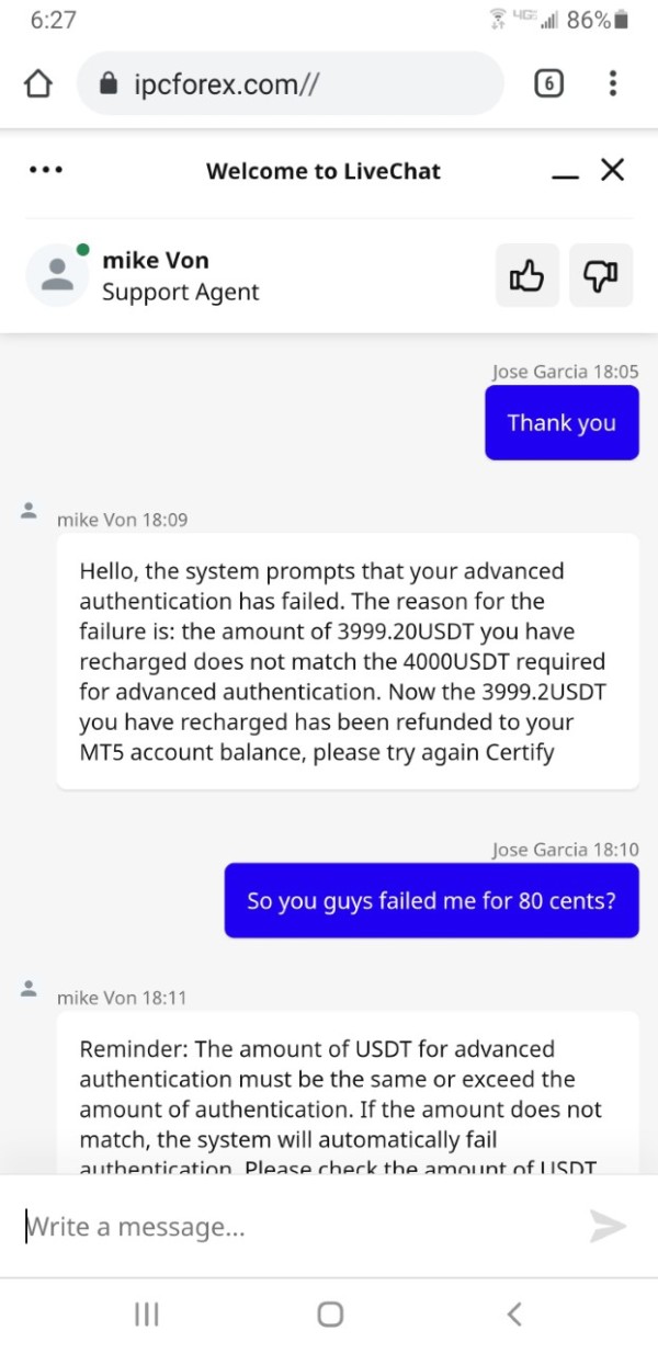 Invertí en Forex por primera vez el mes pasado usando MT5, gané un poco de dinero y cuando fui a retirar mi dinero, debido a que era un poco más de 10,000 USD, activé alguna característica de "certificación avanzada".ipcforex .com (puede que tenga que escribir trader.ipcforex .com) dijo que tenía que recargar 4000usd para completar la "certificación avanzada" para poder retirar mi dinero, así que lo hice. Después de que se quitaron las tarifas, la cantidad que pasó fue 3999.20 y me fallaron por 80 centavos y dijeron que tenía que enviarles otros 4000. Dije que no, todavía tienen mi dinero, y ahora estoy aquí. ¡Por favor ayuda! El dinero que se niegan a permitirme retirar es todo lo que tengo después de perder mi trabajo debido a una situación de covid en abril pasado. Estoy aquí porque ni siquiera sé si puedo confiar en las distintas empresas de recuperación de fondos que existen. Tengo muchas más fotos si es necesario. ¡Gracias a todos de antemano!