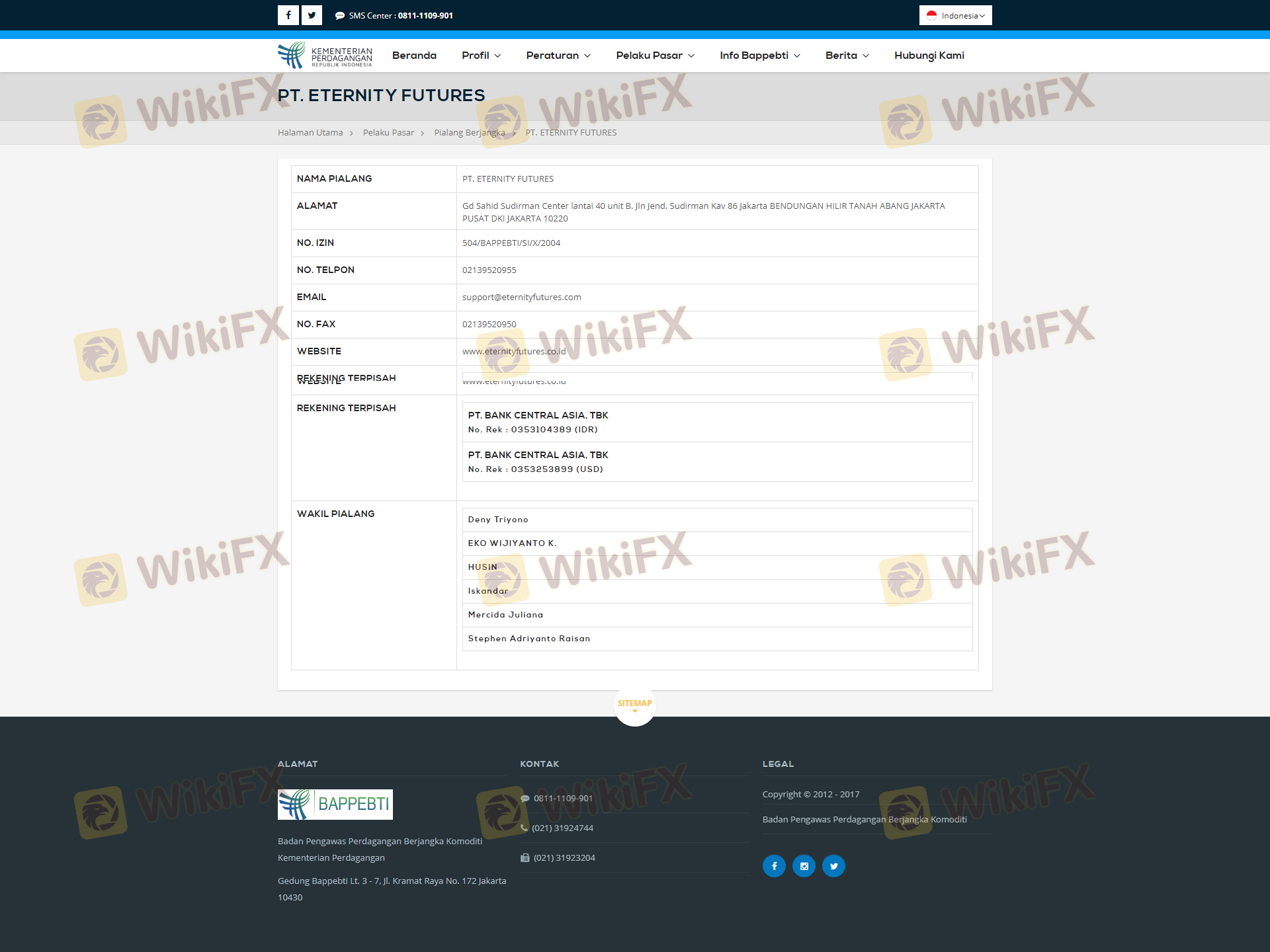Respecto a la legitimidad del bróker de Forex Eternity Futures, proporciona Indonesia BAPPEBTI y (también cuenta con un estudio gráfico sobre seguridad.).