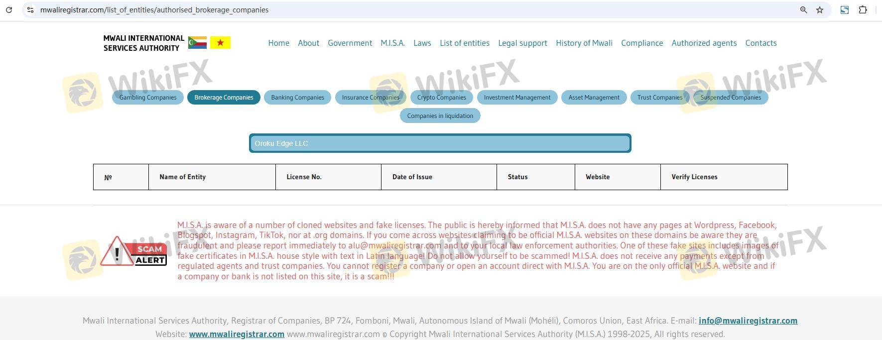 Respecto a la legitimidad del bróker de Forex OROKU EDGE, proporciona Comoras MISA y .