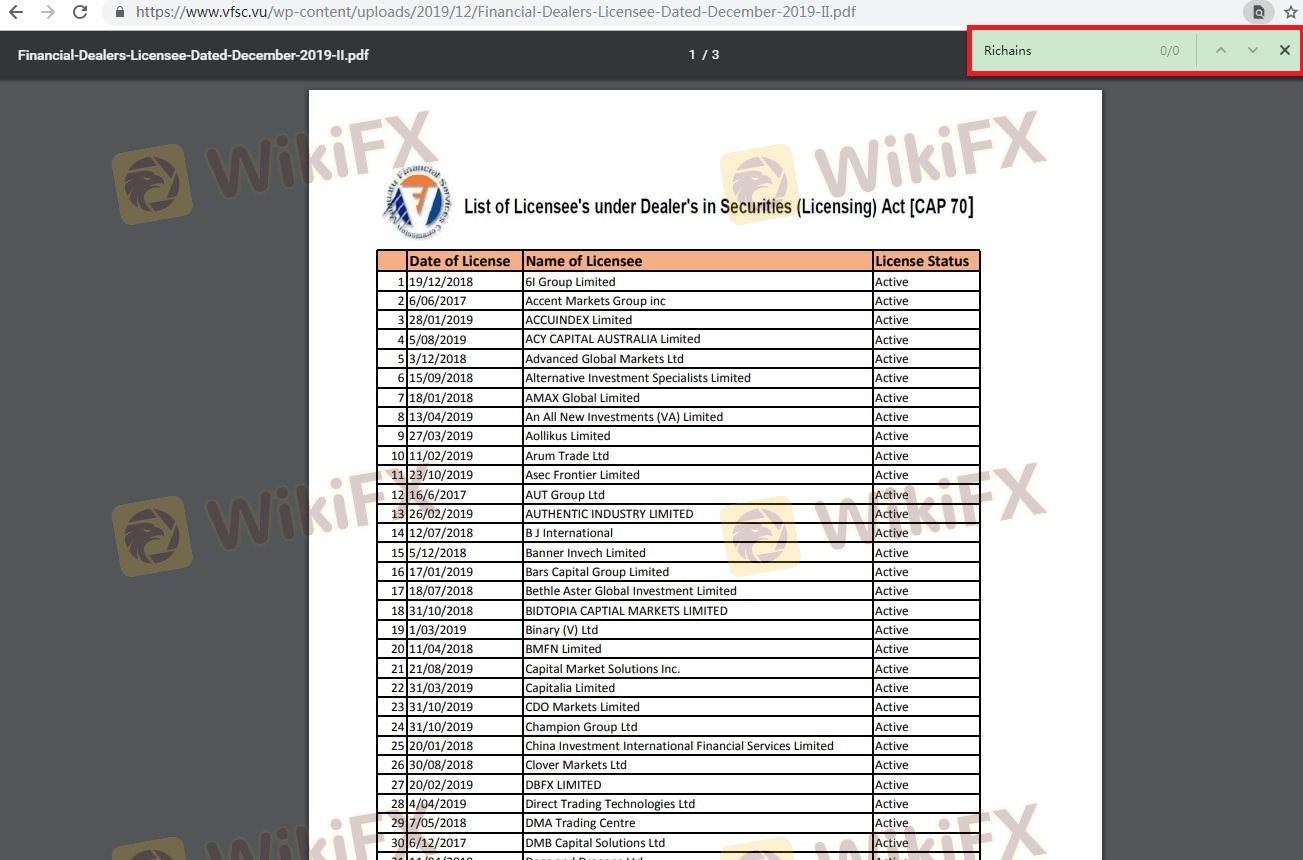 Respecto a la legitimidad del bróker de Forex Richains, proporciona Vanuatu VFSC y .