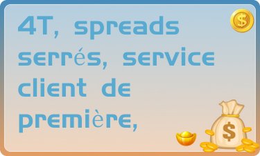 Je viens d'échanger avec 4T depuis une semaine, jusqu'à présent tout va bien ! Les spreads sur l'EUR/USD sont acceptables, la commission est gratuite, MT4 est très pratique à utiliser et le FOREX TRADING GUIDE sur leur site Web m'aide également beaucoup.