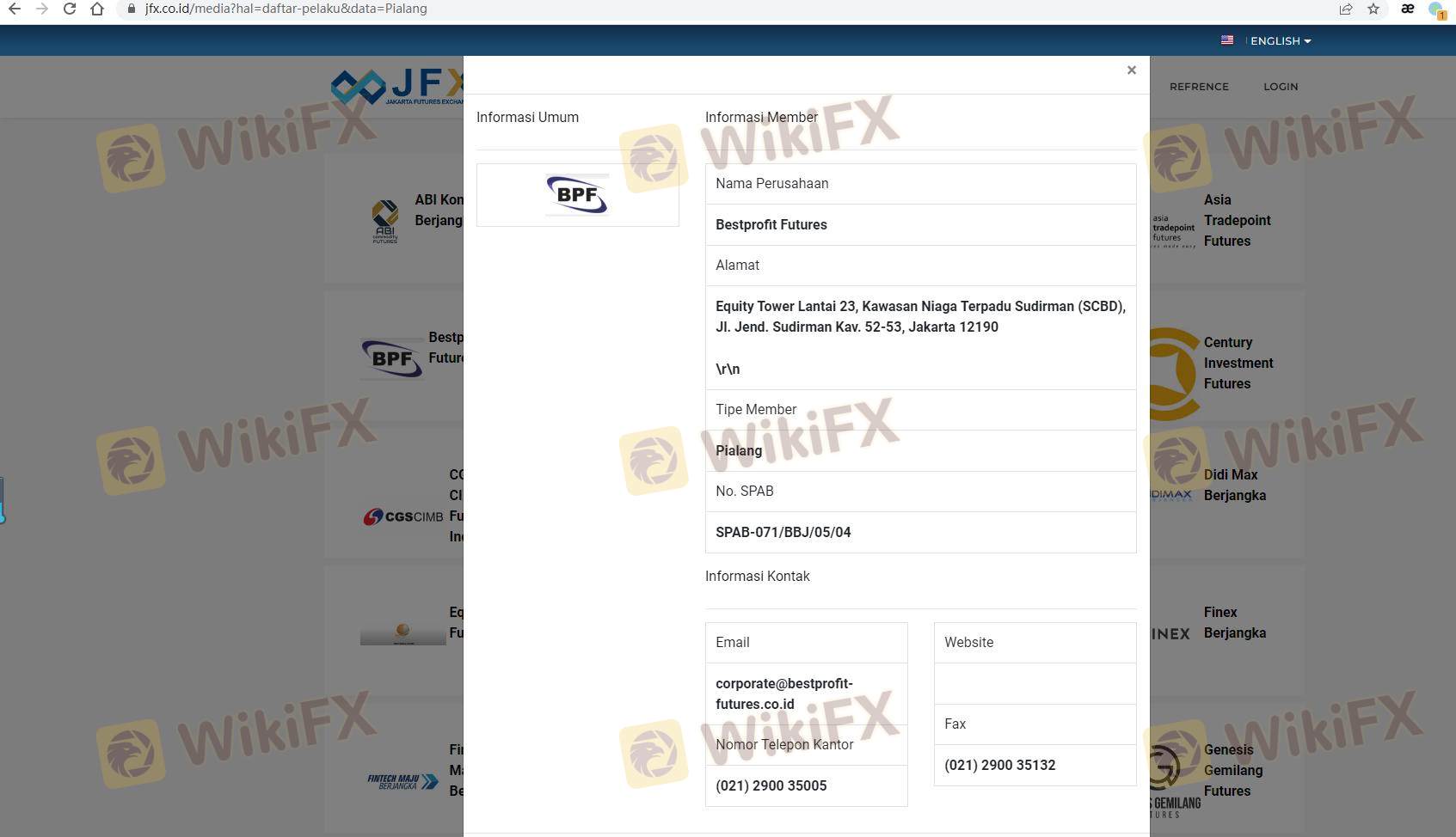 BPF, officiellement connue sous le nom de PT. BestProfit Futures, a été créée en 2004 et s'est construite une présence sur le marché indonésien au fil des ans. La société opère depuis son siège social situé à Jakarta et possède plusieurs bureaux régionaux à travers le pays. L'équipe de direction comprend des professionnels expérimentés du secteur financier, ce qui ajoute de la crédibilité aux opérations du courtier.