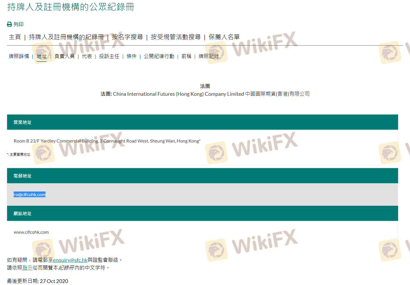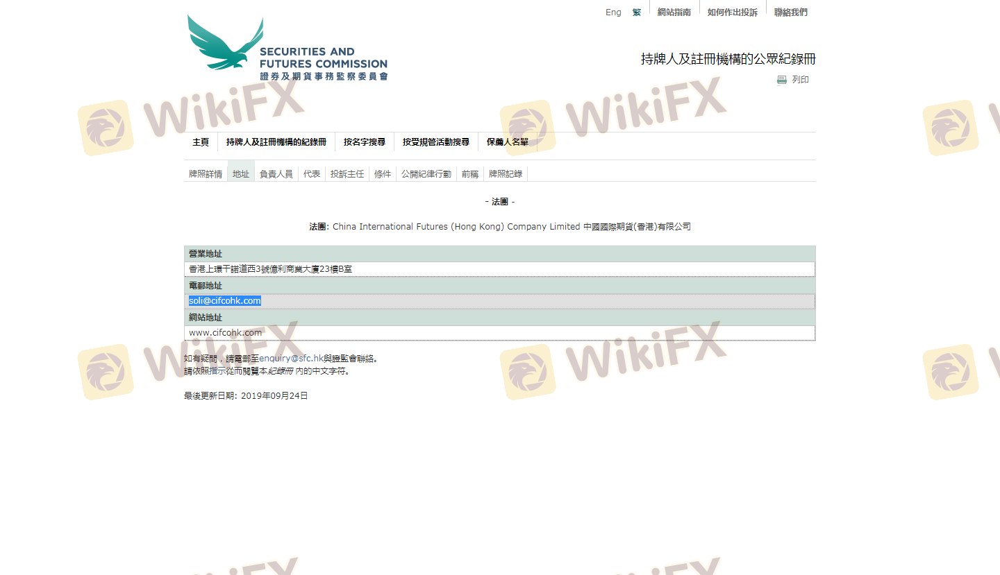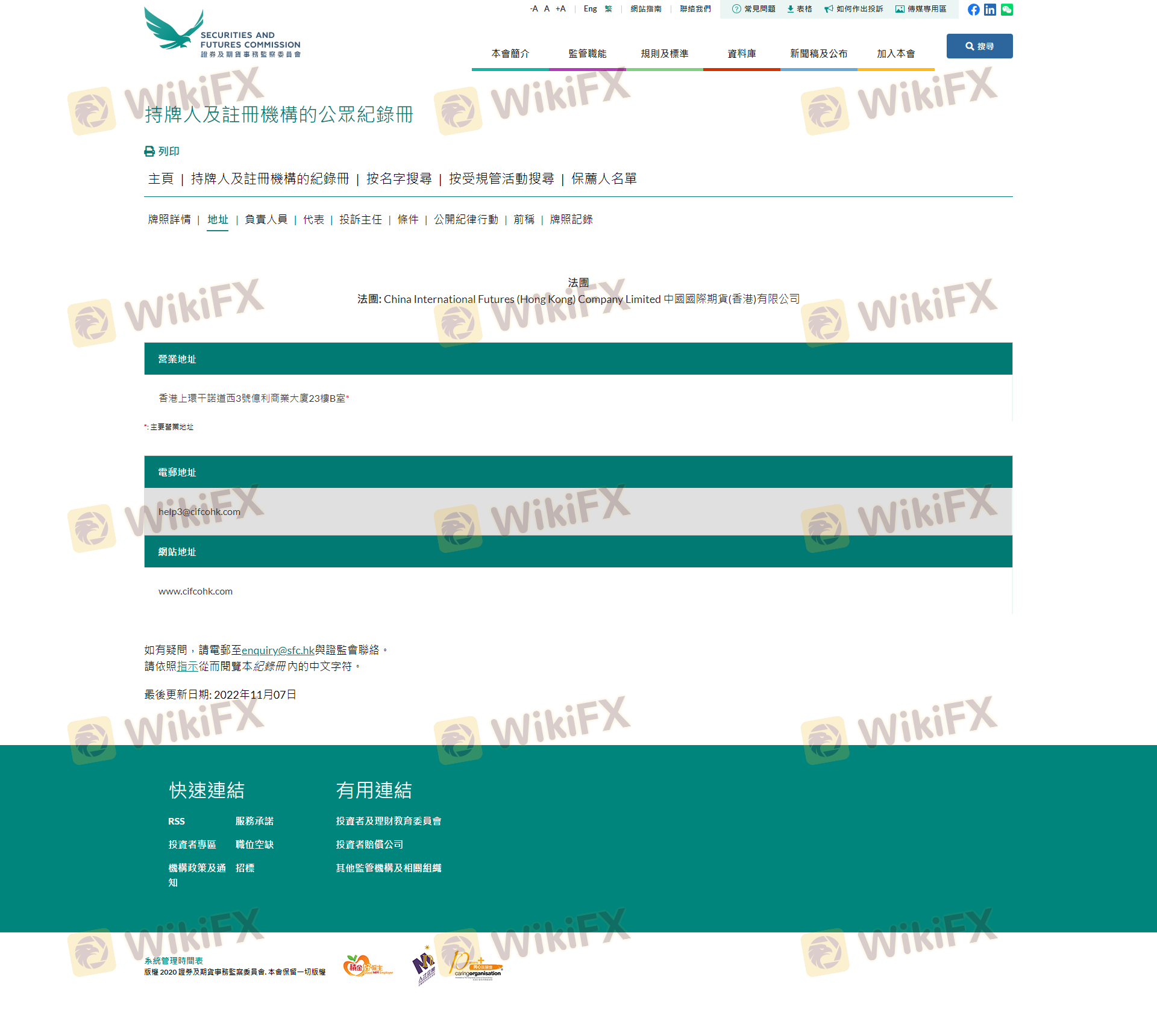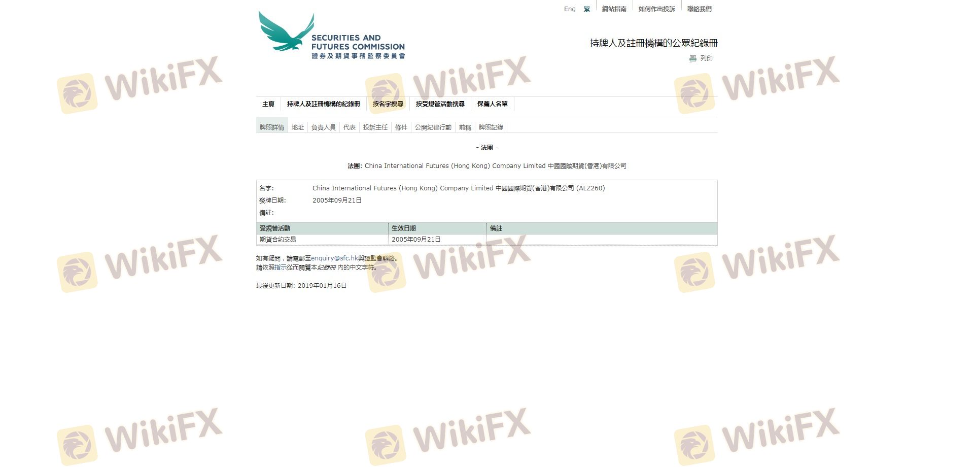 Concernant la légitimité du courtier forex China International Futures (Hong Kong) Company Limited, il fournit SFC et (dispose également d'une enquête graphique sur la sécurité).