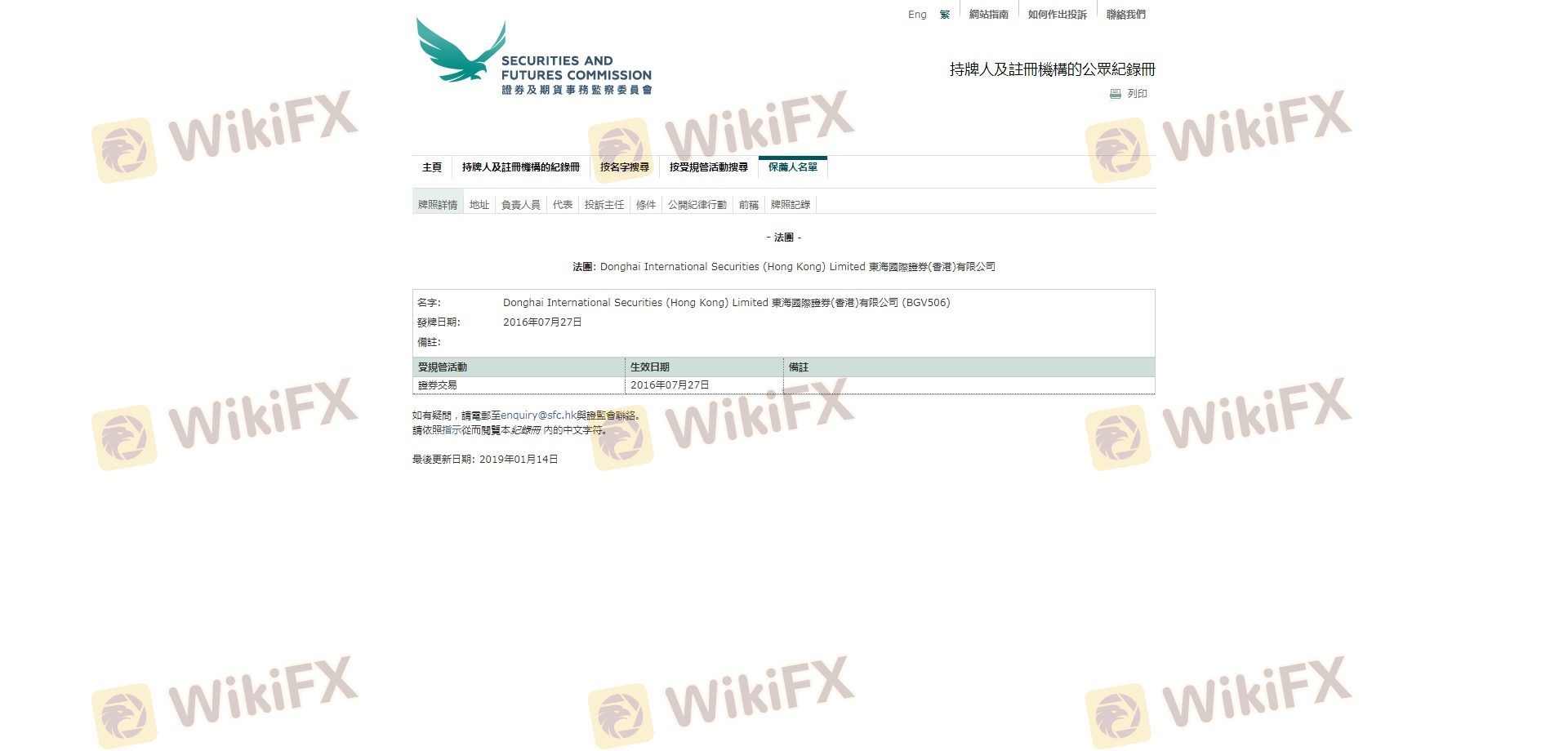 Concernant la légitimité du courtier forex Donghai, il fournit SFC, SFC et (dispose également d'une enquête graphique sur la sécurité).