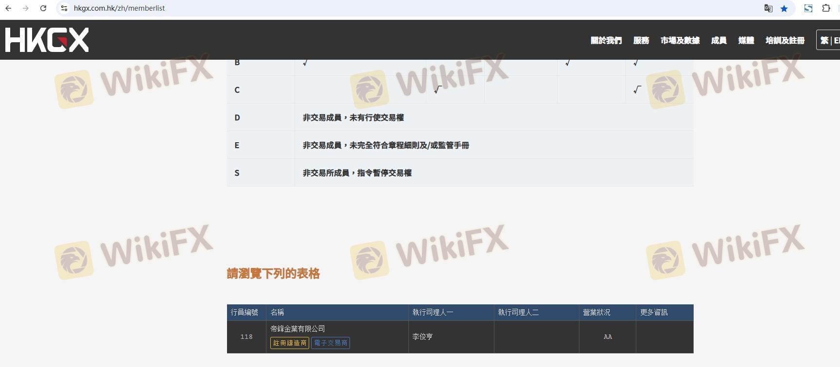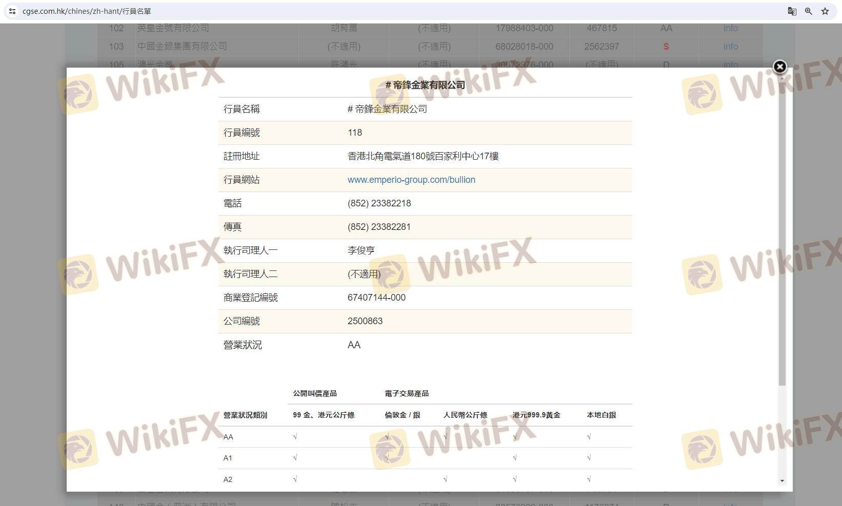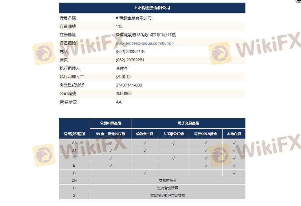 Le statut réglementaire d'un courtier est un facteur clé de sa crédibilité. Emperio Group est réglementé par la Chinese Gold and Silver Exchange Society (CGSE), qui est la seule bourse à Hong Kong facilitant le négoce d'or et d'argent physiques. La supervision réglementaire assurée par la CGSE ajoute une couche de crédibilité aux opérations d'Emperio Group. Voici un résumé des informations réglementaires essentielles concernant Emperio Group :