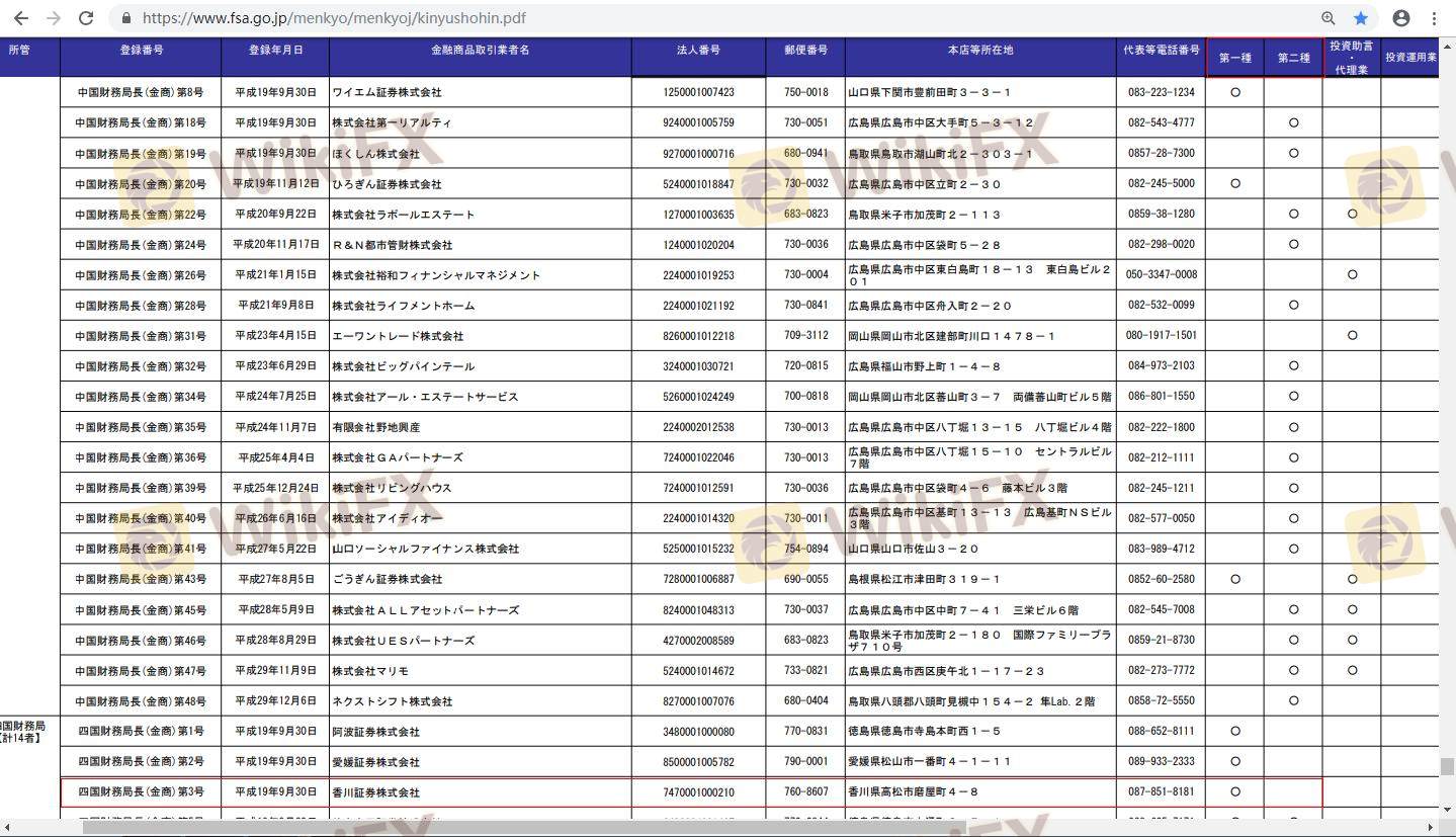 | Agence des Services Financiers (FSA) | 四国 財務 局長 (金商) 第 3 号 | Japon | Vérifié |