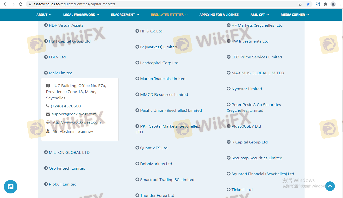 Le cadre réglementaire entourant un courtier est essentiel pour évaluer sa légitimité et son intégrité opérationnelle. Rock-West opère sous la supervision de l'Autorité des Services Financiers des Seychelles (FSA), détenant une licence de détail en forex. Cependant, la nature de la régulation offshore soulève souvent des inquiétudes concernant la qualité de la surveillance et la protection des investisseurs.
