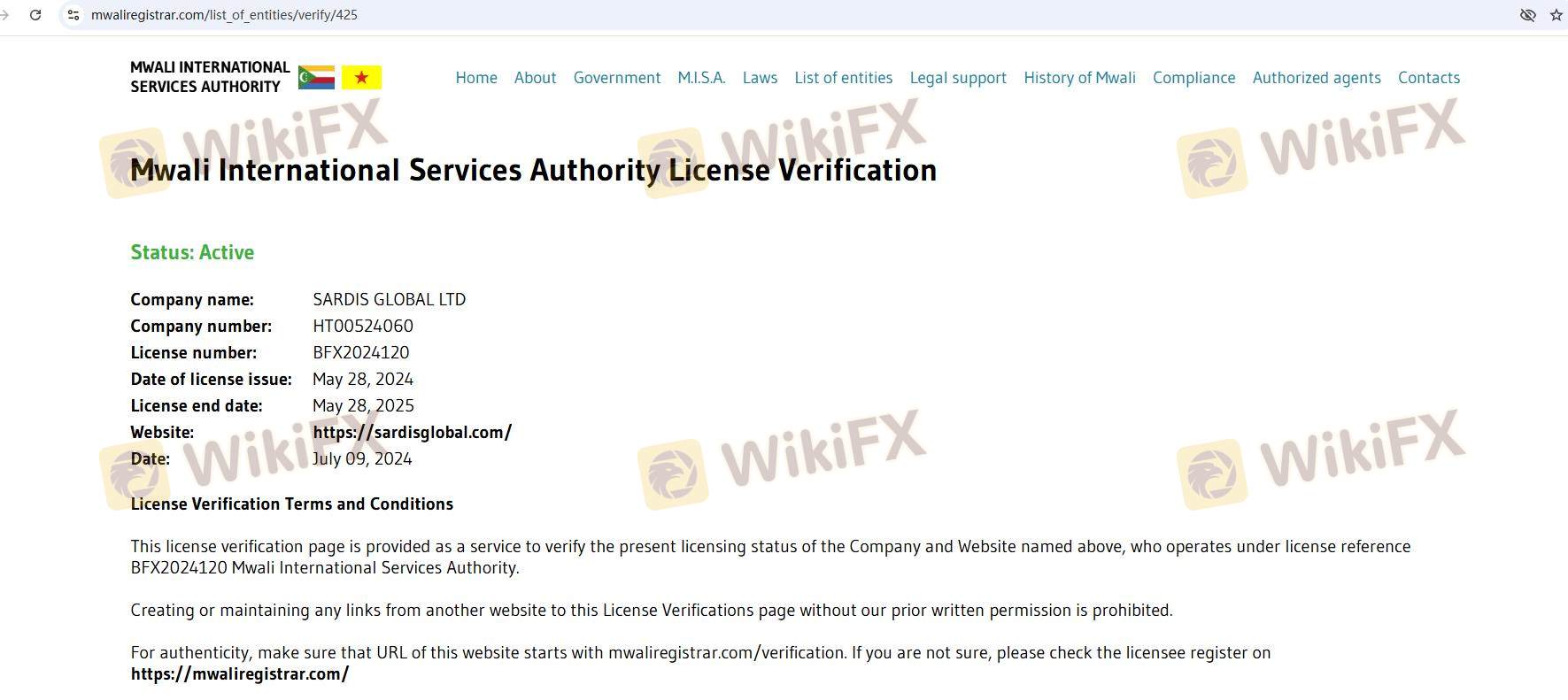 Le cadre réglementaire dans lequel un courtier opère est l'un des facteurs les plus critiques affectant sa crédibilité. Sardis Global affirme être régulé par la Mwali International Services Authority (MISA) dans l'Union des Comores. Cependant, il est essentiel d'examiner la légitimité et l'efficacité de telles régulations offshore.