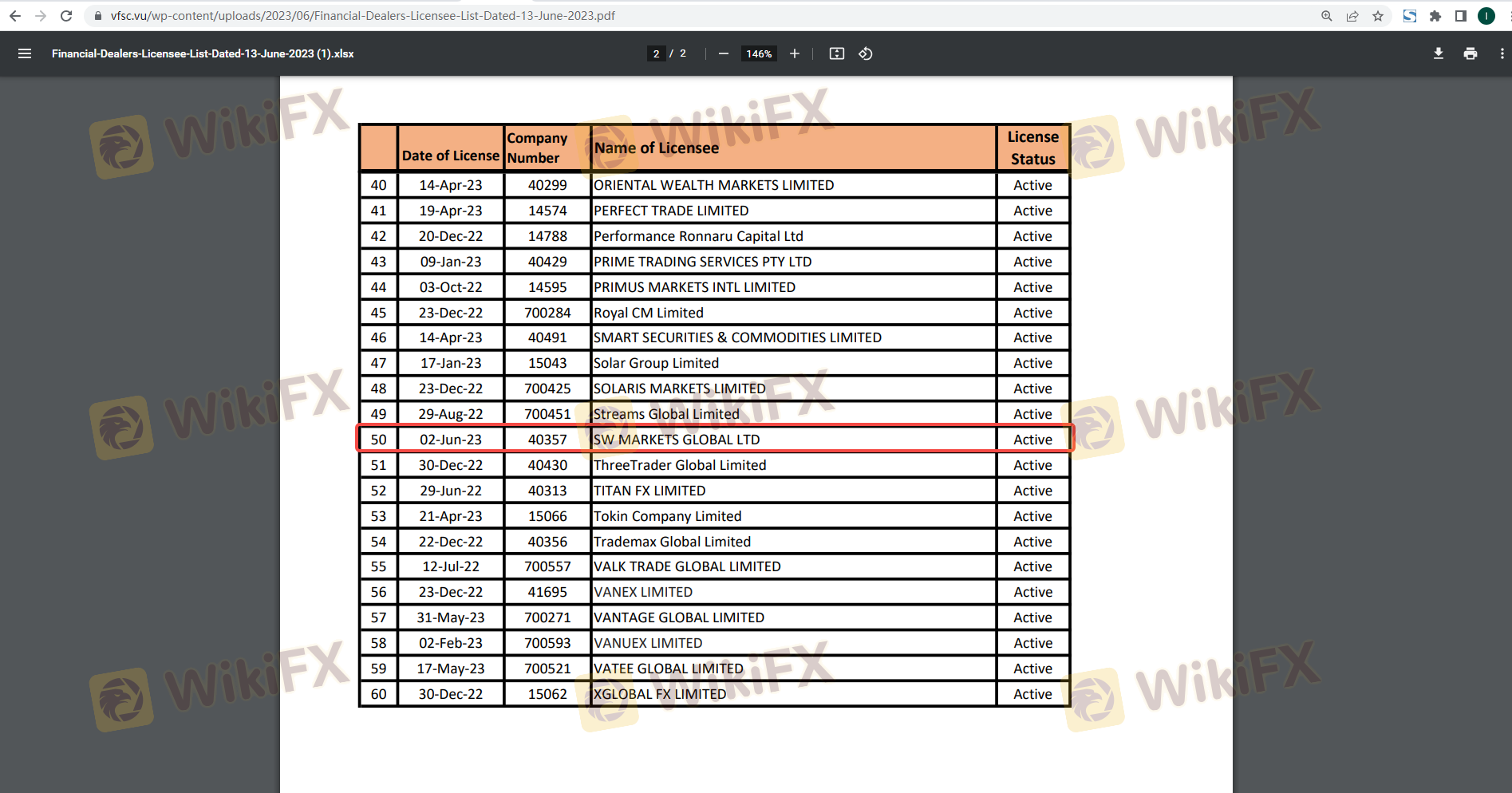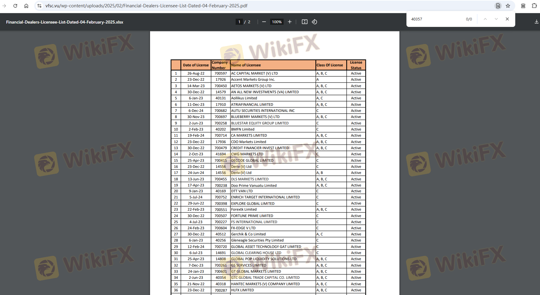 | Vanuatu Financial Services Commission | 40357 | Vanuatu | Actif |