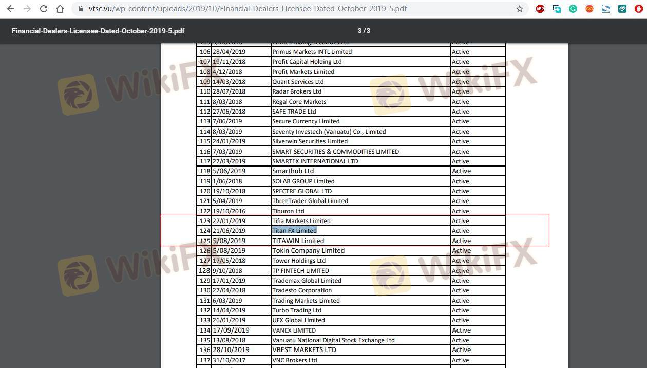 Concernant la légitimité du courtier forex TITAN FX, il fournit VFSC, FSA, FSC et (dispose également d'une enquête graphique sur la sécurité).