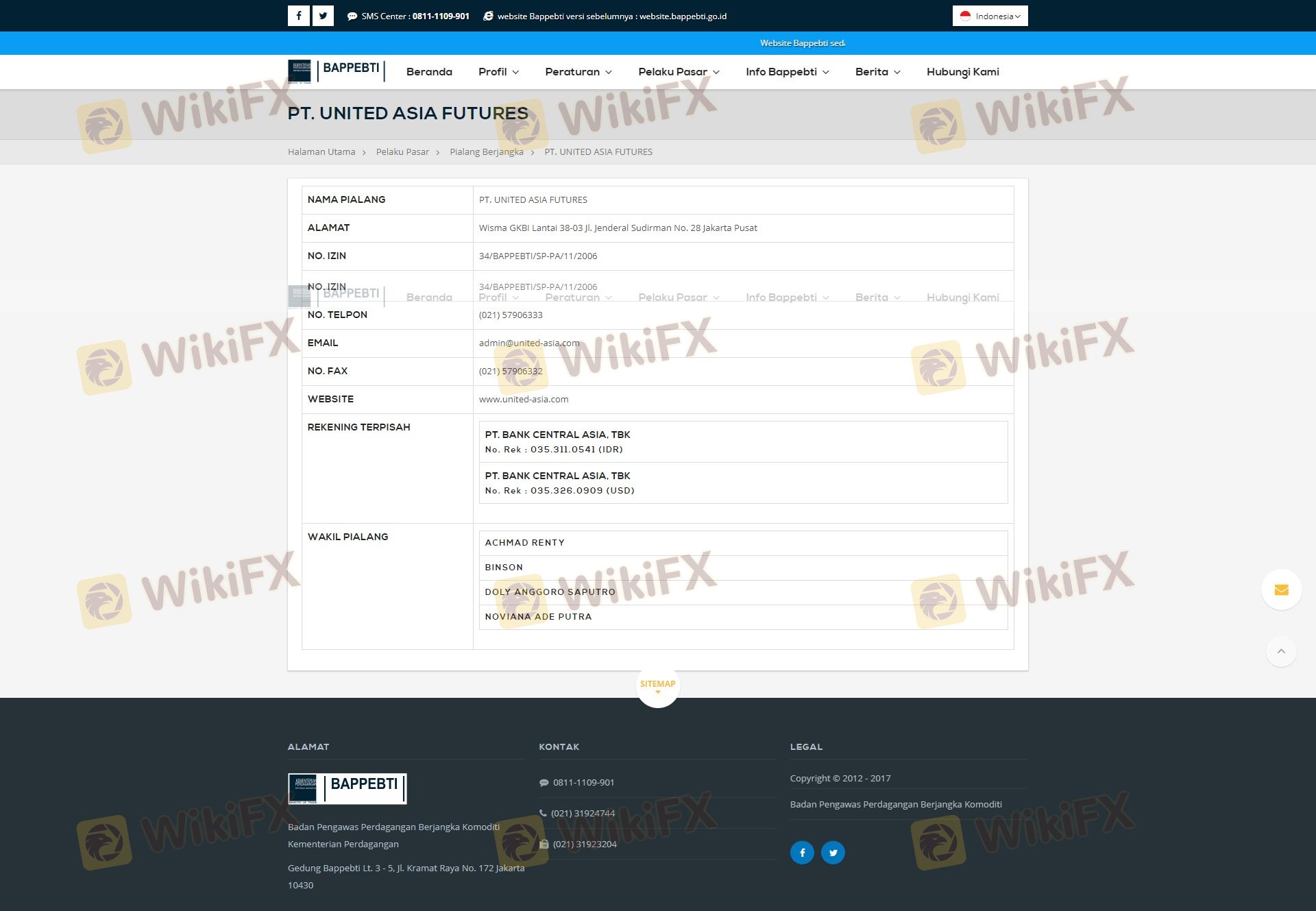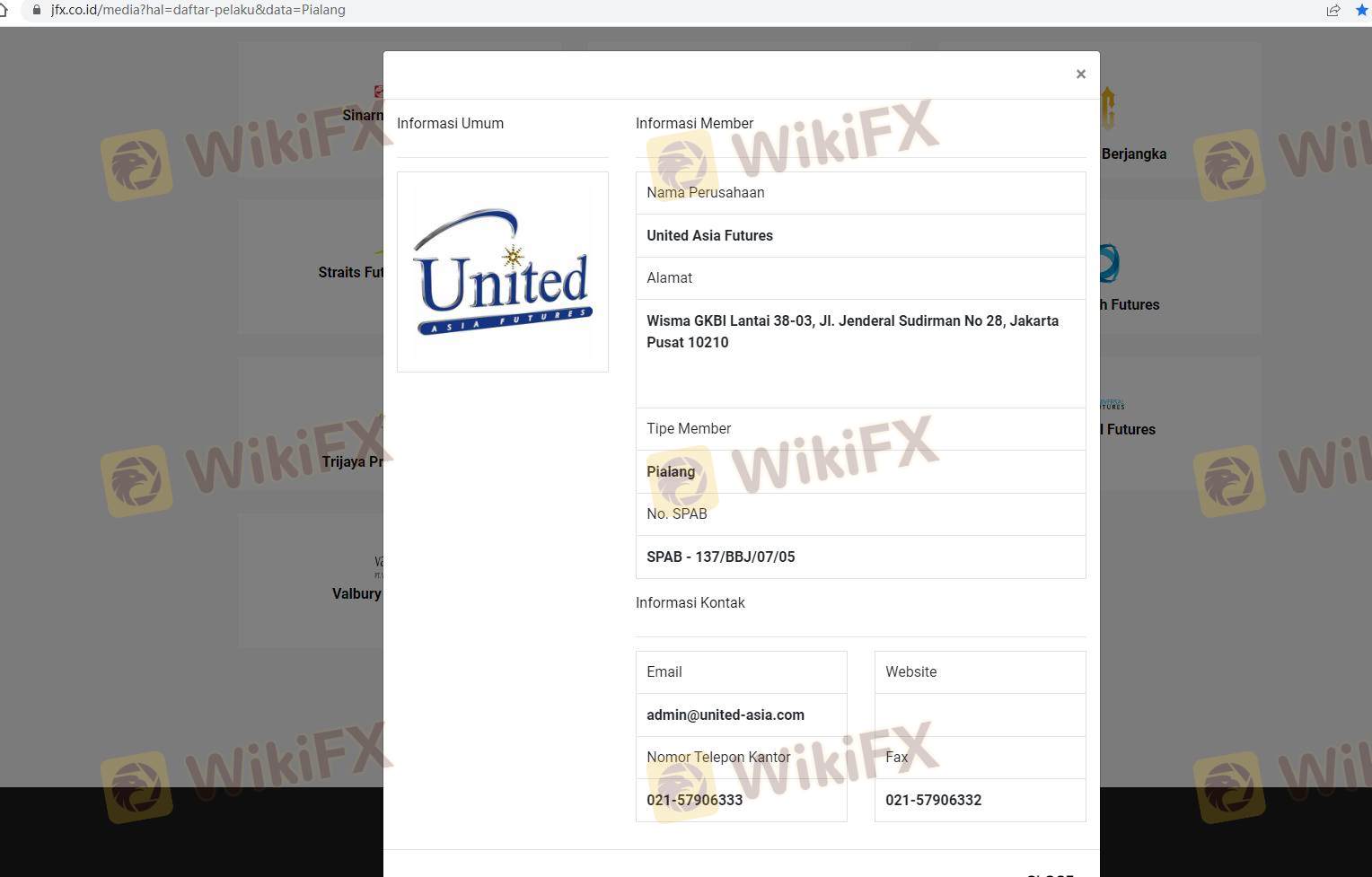 Concernant la légitimité du courtier forex United Asia Futures, il fournit BAPPEBTI, JFX et (dispose également d'une enquête graphique sur la sécurité).
