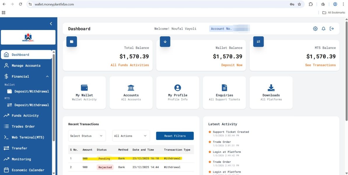 Didirikan sekitar 5 hingga 10 tahun yang lalu, Moneyplant adalah broker forex berbasis di Inggris yang berhasil menegakkan dirinya di pasar yang sangat kompetitif. Namun, ia kurang memiliki pengawasan regulasi, yang secara tradisional menjadi pusat untuk membangun kredibilitas di sektor perdagangan forex. Pengguna mengungkapkan kekhawatiran mengenai stabilitas operasional dan keandalannya, yang semakin rumit dengan laporan sporadis tentang downtime situs web. Dengan fokus yang khas pada trader pemula, ia menawarkan opsi perdagangan yang dirancang untuk berbiaya rendah dan berpotensi imbal hasil tinggi, namun fitur-fitur ini disertai dengan faktor risiko yang cukup besar karena lingkungan yang tidak diatur.